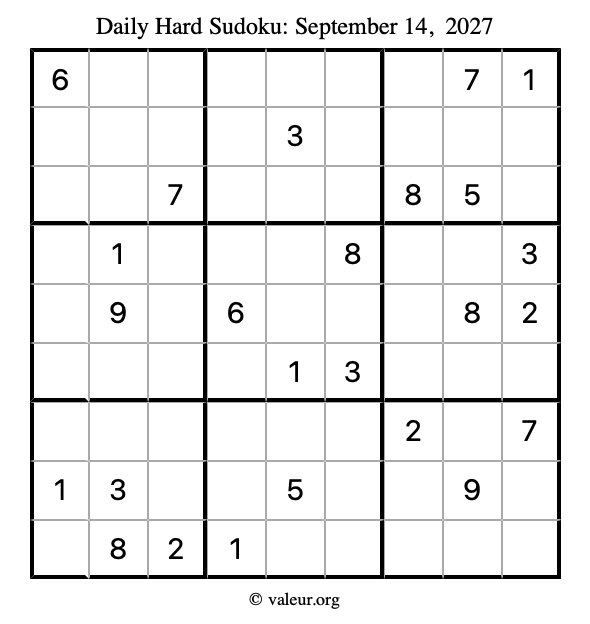 Daily Four Sudoku Puzzles September 14, 2027 is not the only daily set of sudoku puzzles we have. We create four sudoku puzzles every day for you to print and solve. Check out today's set of four sudoku puzzles here!