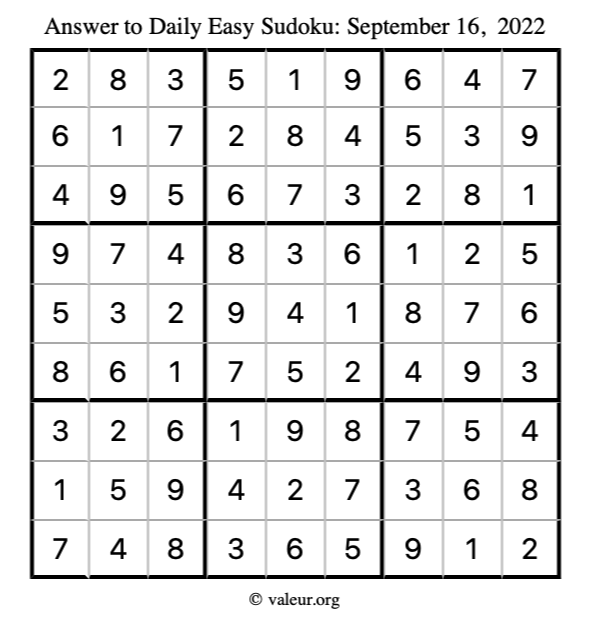 Here are the September 16, 2022 daily four sudoku puzzles. You are welcome to print a copy of the puzzles and solve them by hand. For your convenience, we have also included the solutions further down the page so you can check your work.