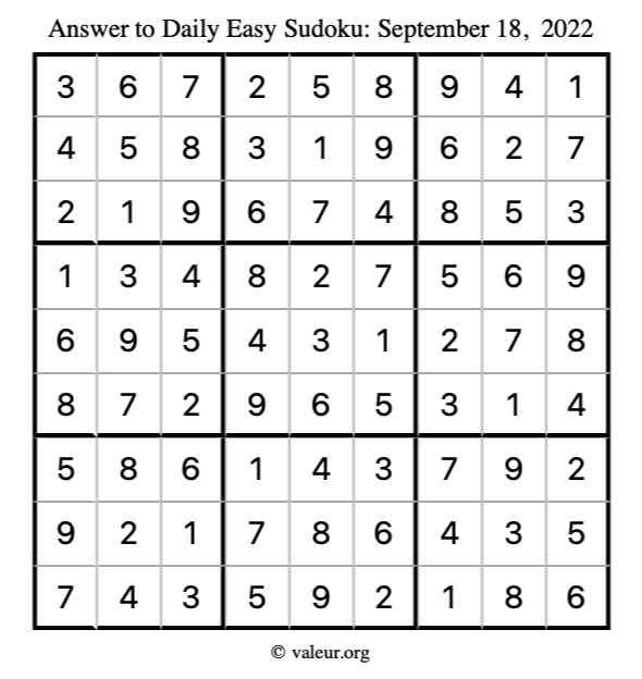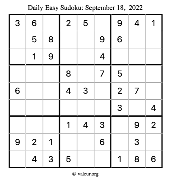 Here are the September 18, 2022 daily four sudoku puzzles. You are welcome to print a copy of the puzzles and solve them by hand. For your convenience, we have also included the solutions further down the page so you can check your work.