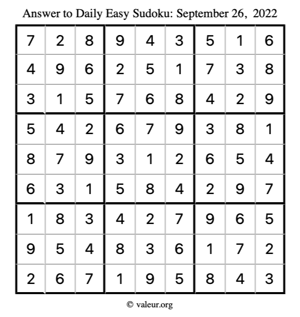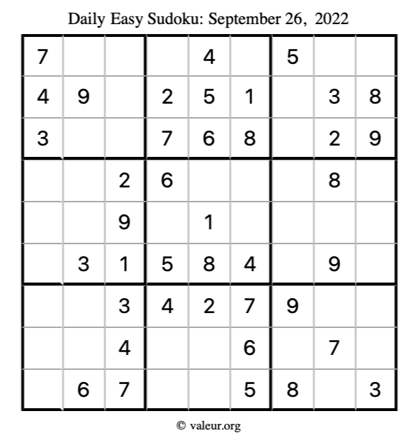 Here are the September 26, 2022 daily four sudoku puzzles. You are welcome to print a copy of the puzzles and solve them by hand. For your convenience, we have also included the solutions further down the page so you can check your work.