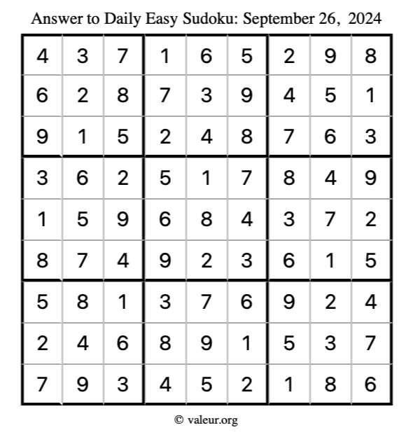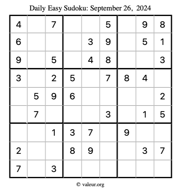 Daily Four Sudoku Puzzles September 26, 2024 is not the only daily set of sudoku puzzles we have. We create four sudoku puzzles every day for you to print and solve. Check out today's set of four sudoku puzzles here!