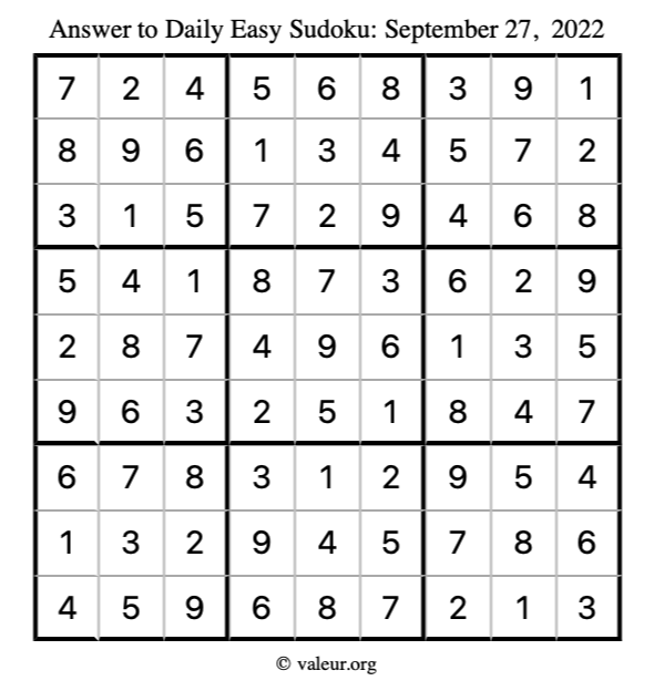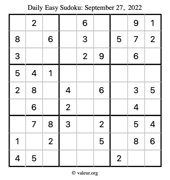 Here are the September 27, 2022 daily four sudoku puzzles. You are welcome to print a copy of the puzzles and solve them by hand. For your convenience, we have also included the solutions further down the page so you can check your work.