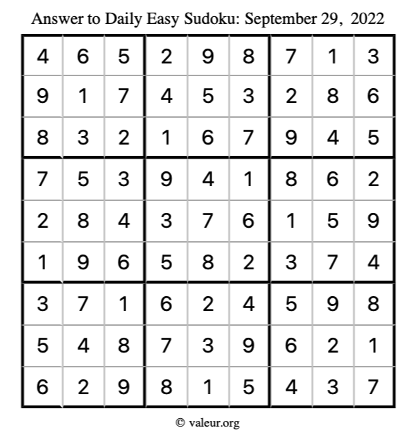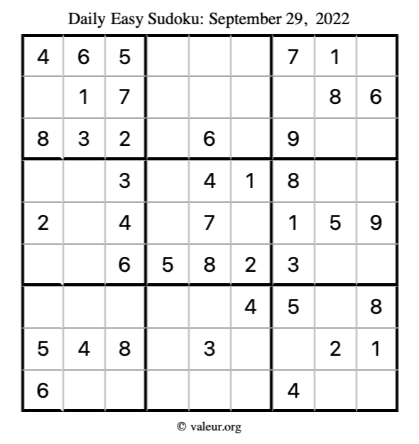 Here are the September 29, 2022 daily four sudoku puzzles. You are welcome to print a copy of the puzzles and solve them by hand. For your convenience, we have also included the solutions further down the page so you can check your work.