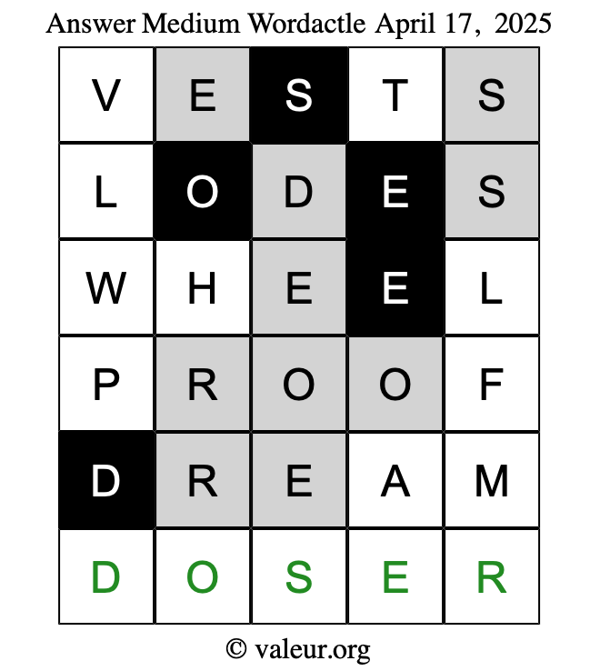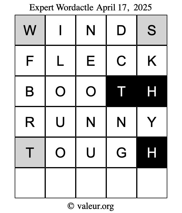Here are the April 17, 2025 daily four Wordactle puzzles. You are welcome to print a copy of the puzzles and solve them by hand. For your convenience, we have also included the solutions further down the page so you can check your work.