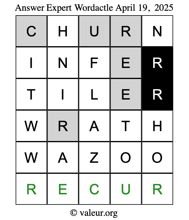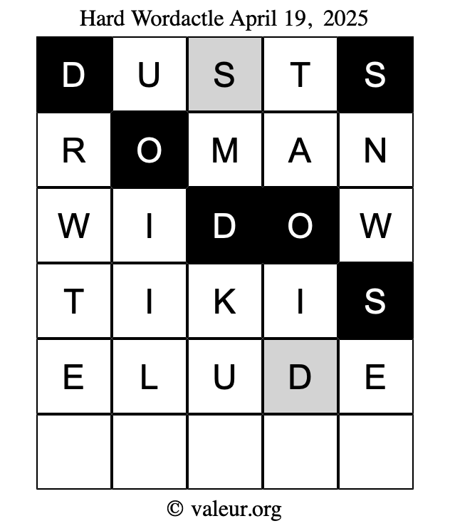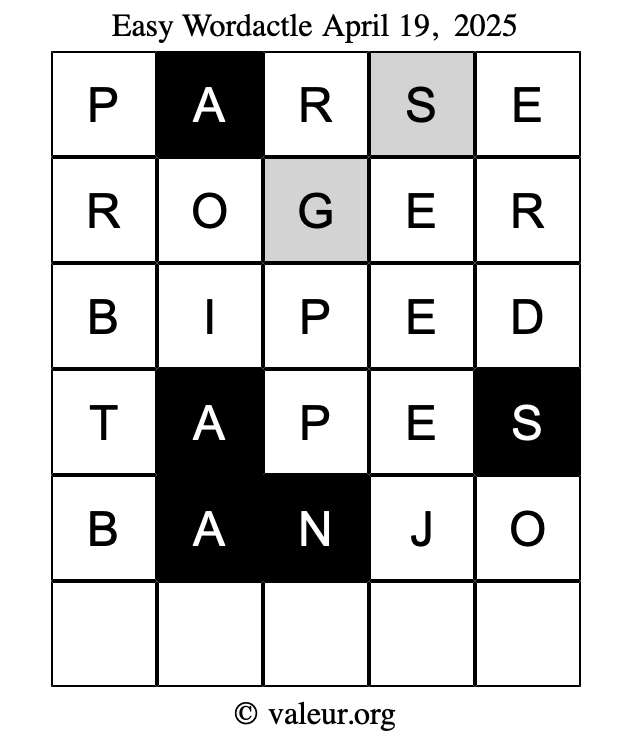 Here are the April 19, 2025 daily four Wordactle puzzles. You are welcome to print a copy of the puzzles and solve them by hand. For your convenience, we have also included the solutions further down the page so you can check your work.