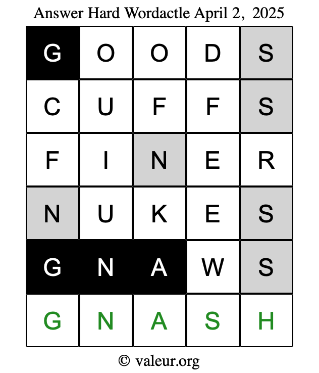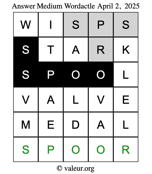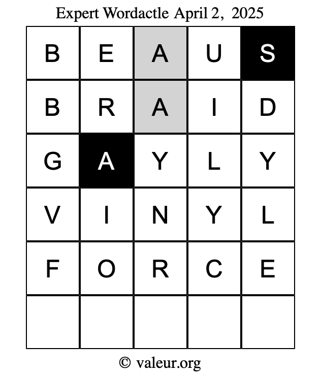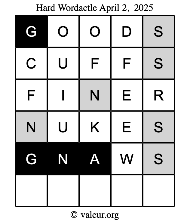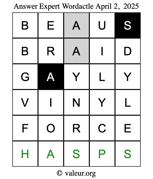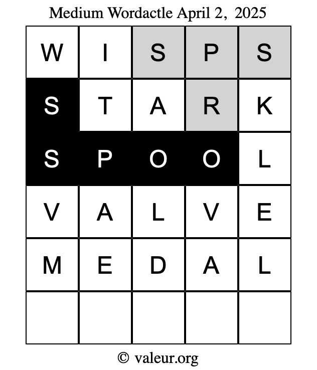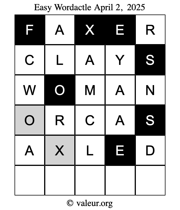 Here are the April 2, 2025 daily four Wordactle puzzles. You are welcome to print a copy of the puzzles and solve them by hand. For your convenience, we have also included the solutions further down the page so you can check your work.