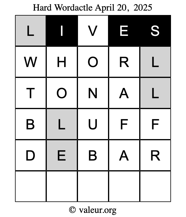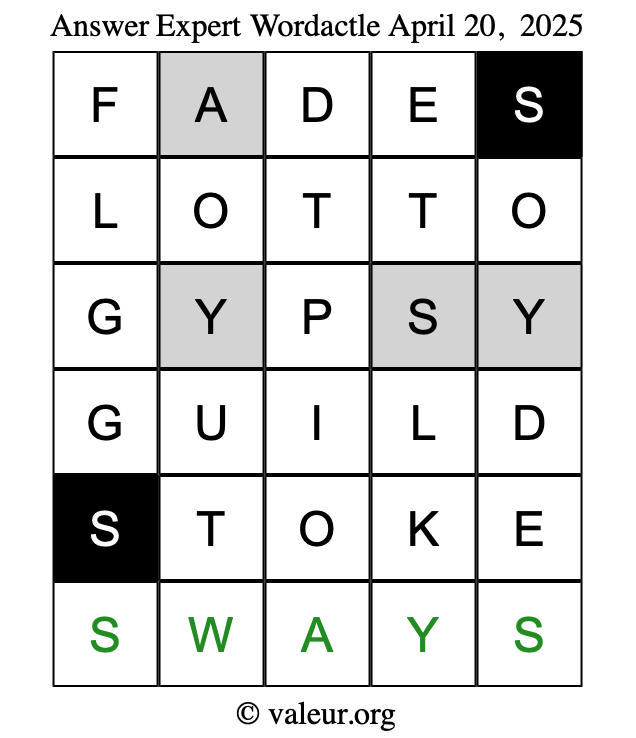 Here are the April 20, 2025 daily four Wordactle puzzles. You are welcome to print a copy of the puzzles and solve them by hand. For your convenience, we have also included the solutions further down the page so you can check your work.
