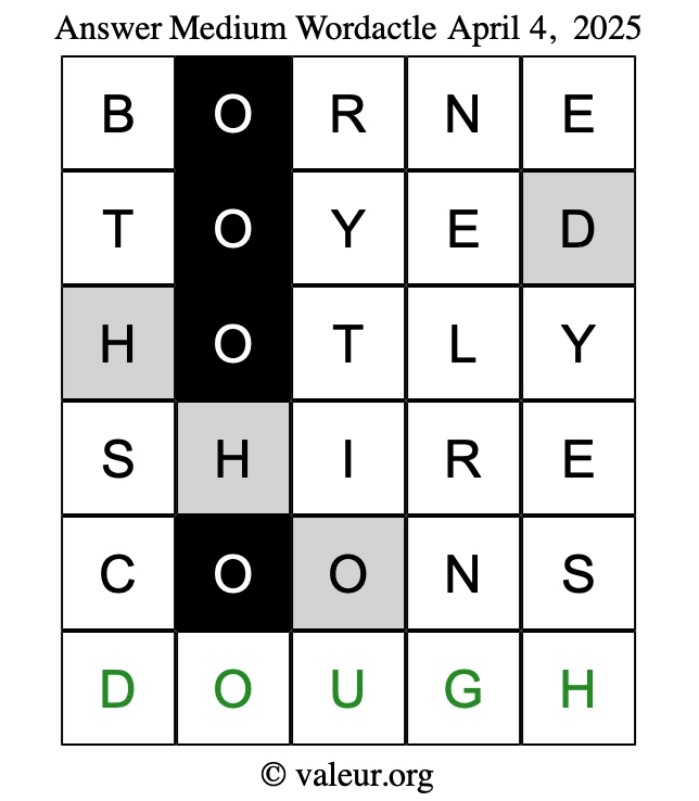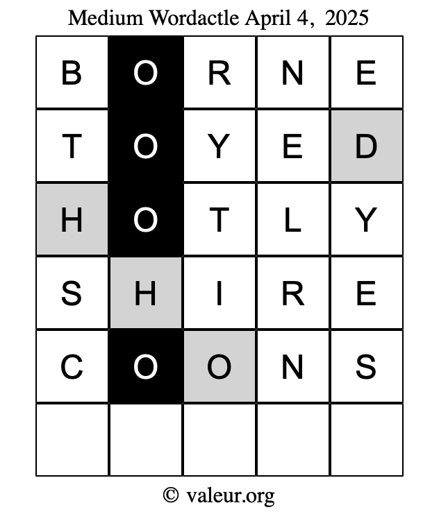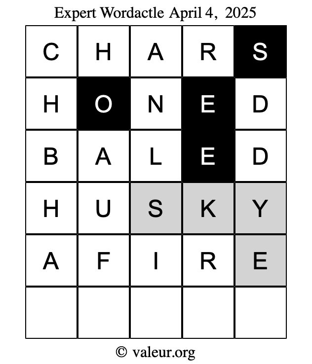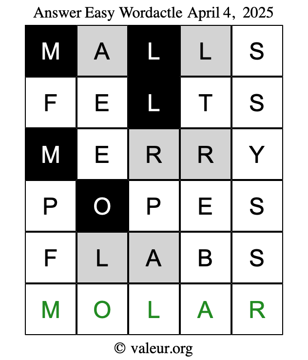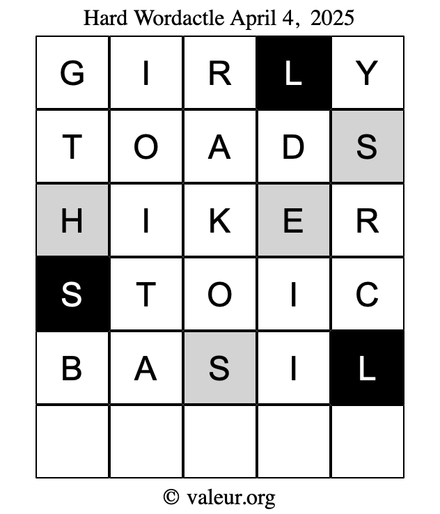 Here are the April 4, 2025 daily four Wordactle puzzles. You are welcome to print a copy of the puzzles and solve them by hand. For your convenience, we have also included the solutions further down the page so you can check your work.