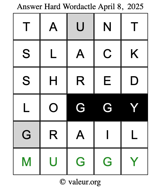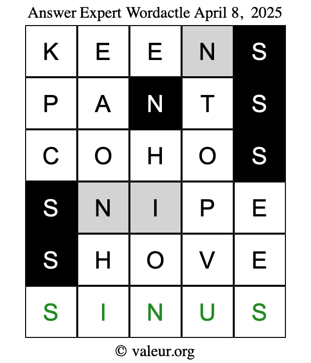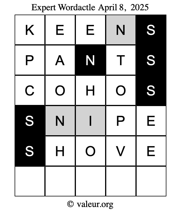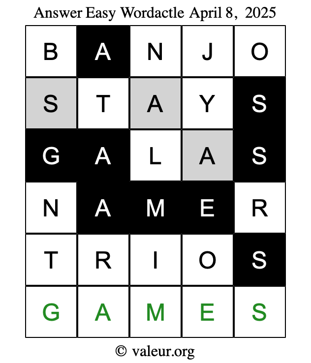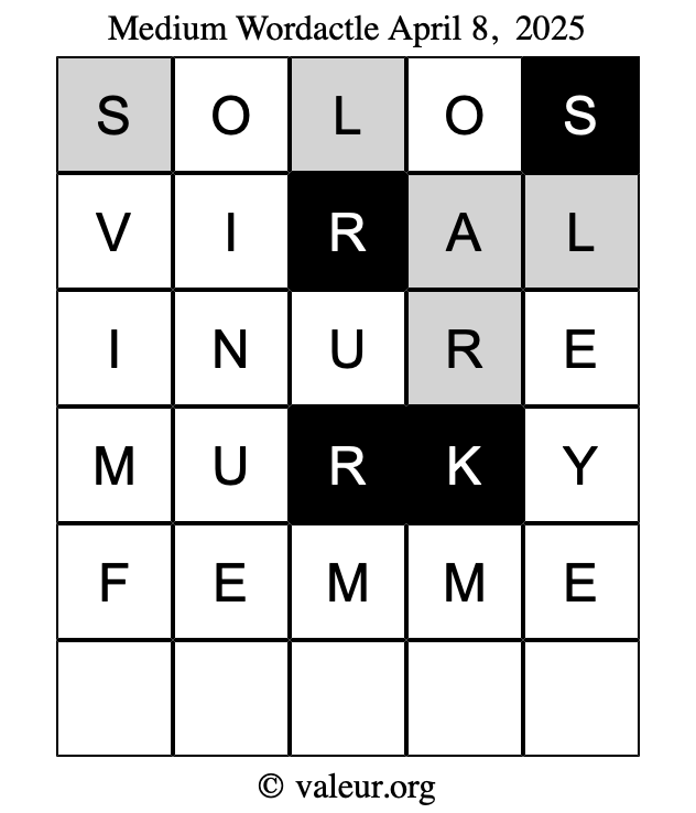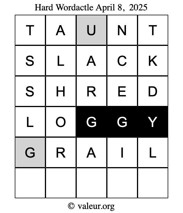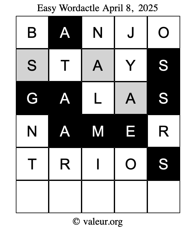 Here are the April 8, 2025 daily four Wordactle puzzles. You are welcome to print a copy of the puzzles and solve them by hand. For your convenience, we have also included the solutions further down the page so you can check your work.