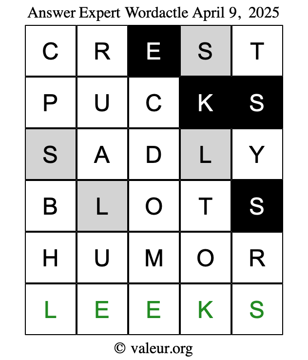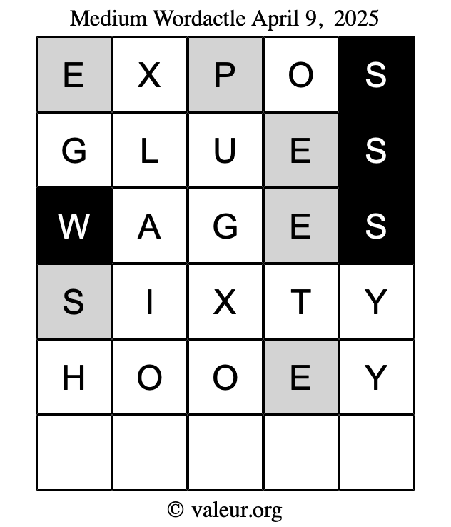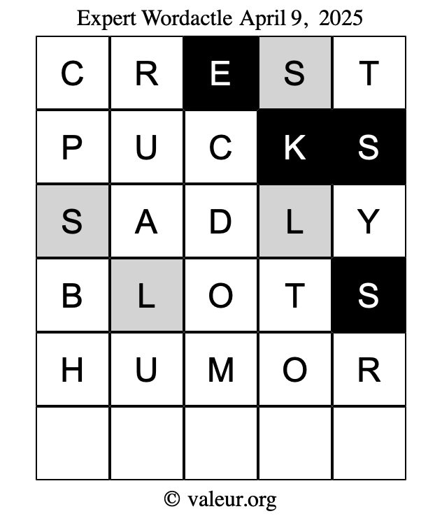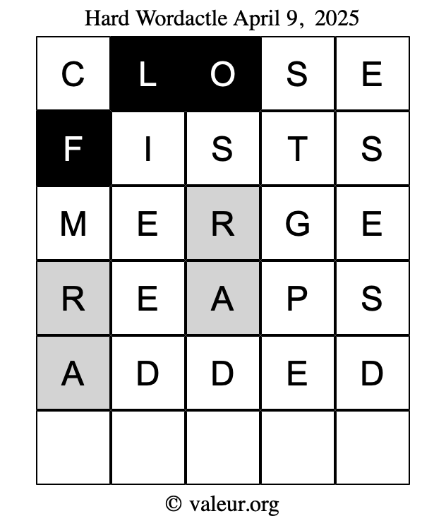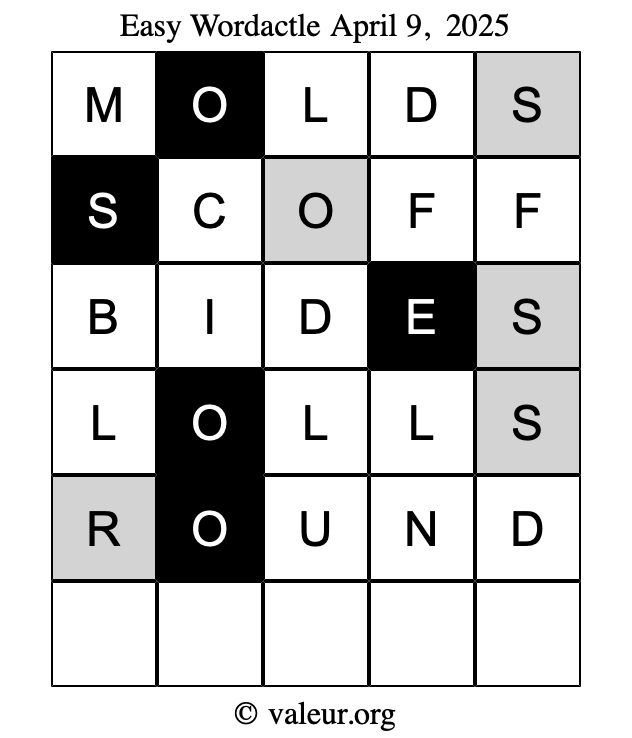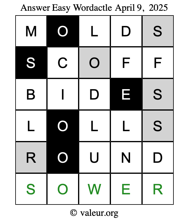 Here are the April 9, 2025 daily four Wordactle puzzles. You are welcome to print a copy of the puzzles and solve them by hand. For your convenience, we have also included the solutions further down the page so you can check your work.