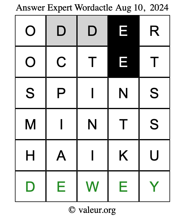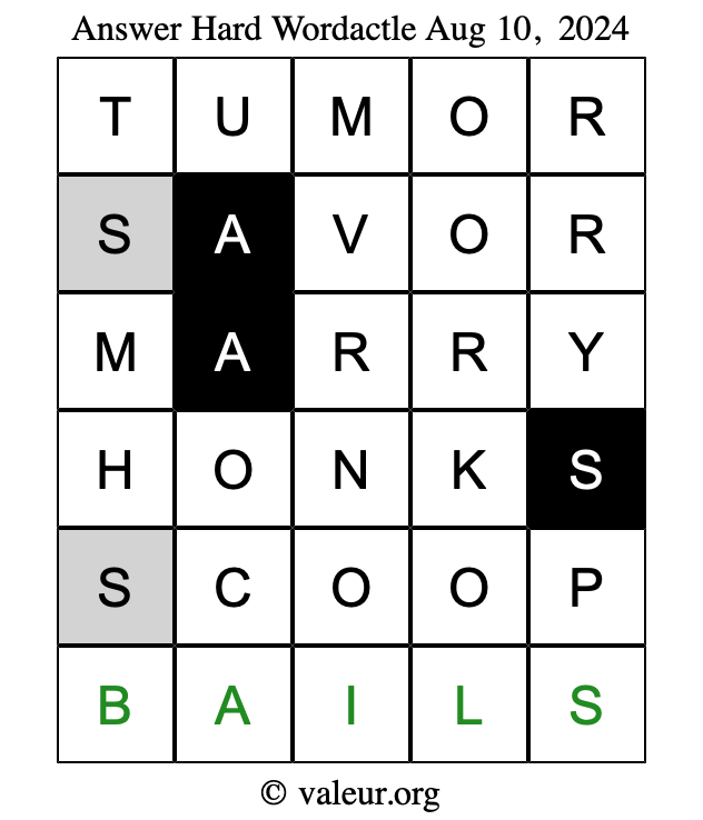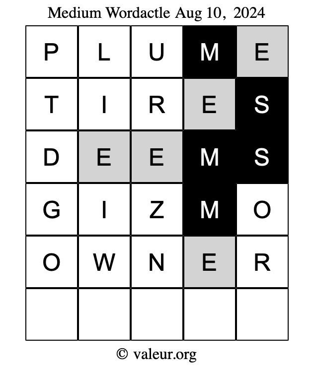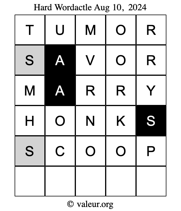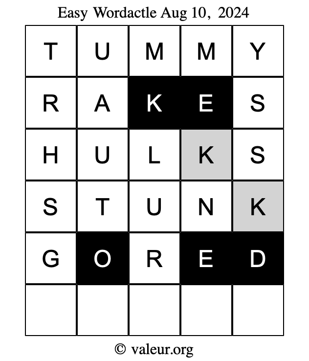 Here are the August 10, 2024 daily four Wordactle puzzles. You are welcome to print a copy of the puzzles and solve them by hand. For your convenience, we have also included the solutions further down the page so you can check your work.