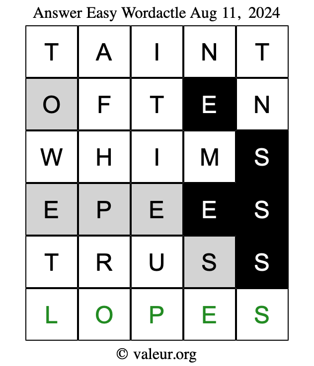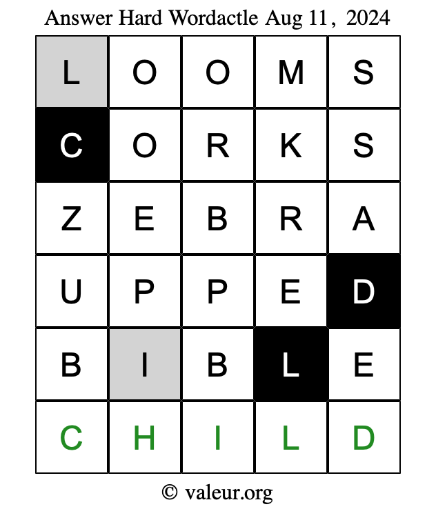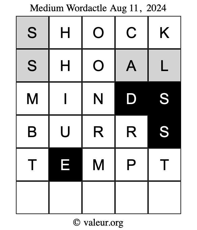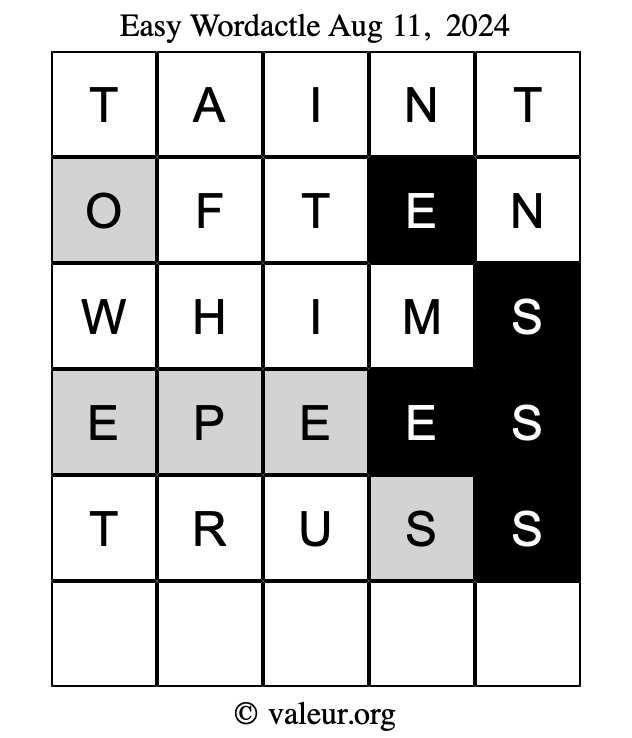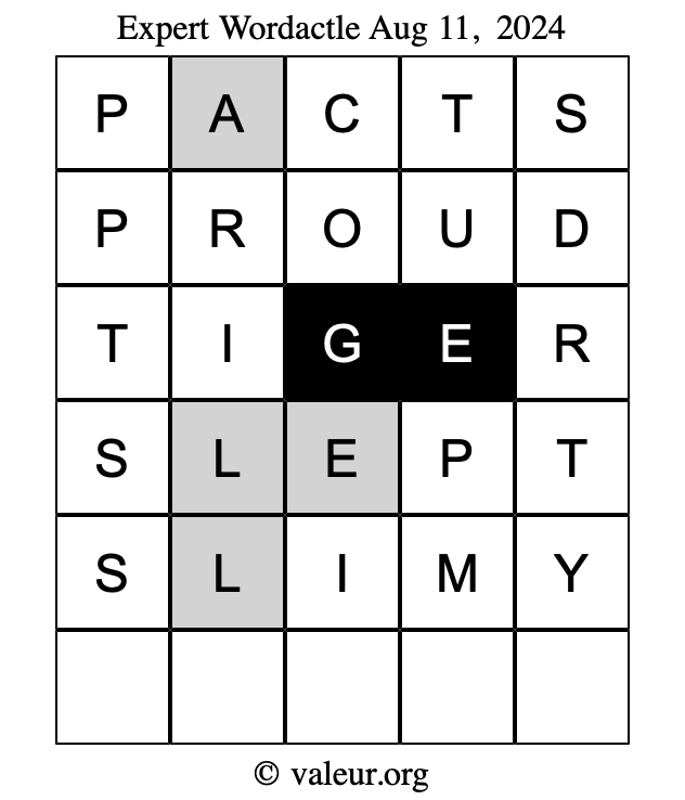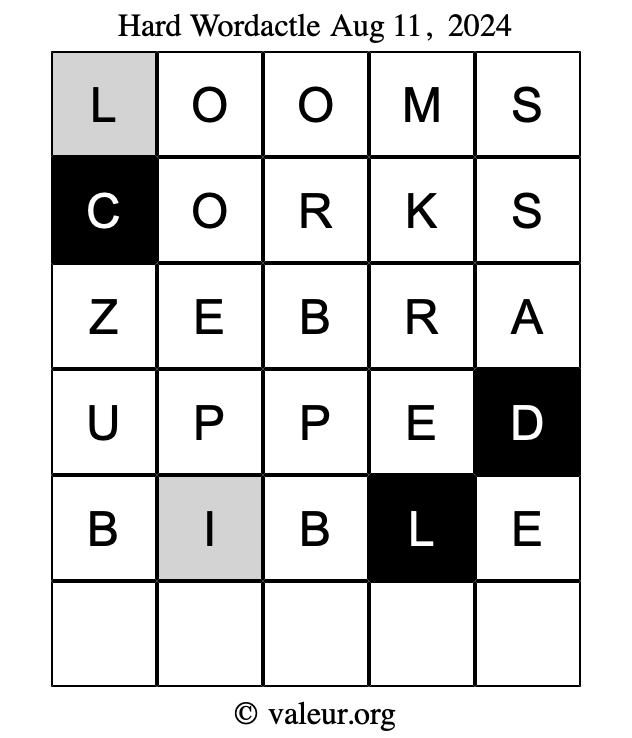 Here are the August 11, 2024 daily four Wordactle puzzles. You are welcome to print a copy of the puzzles and solve them by hand. For your convenience, we have also included the solutions further down the page so you can check your work.