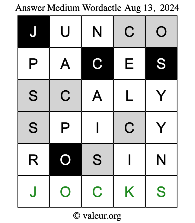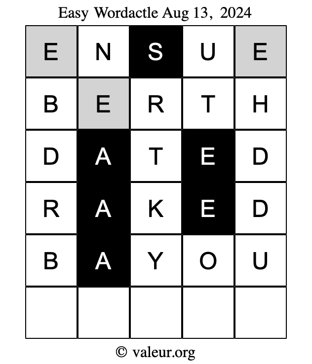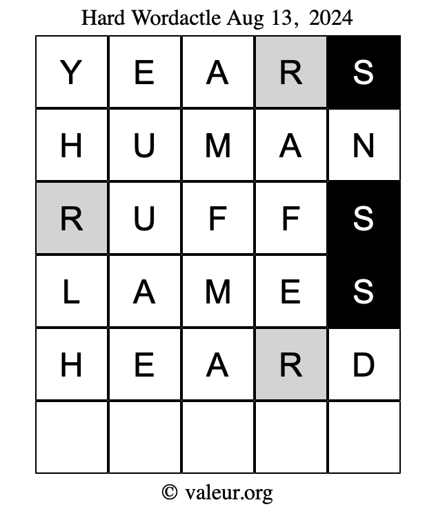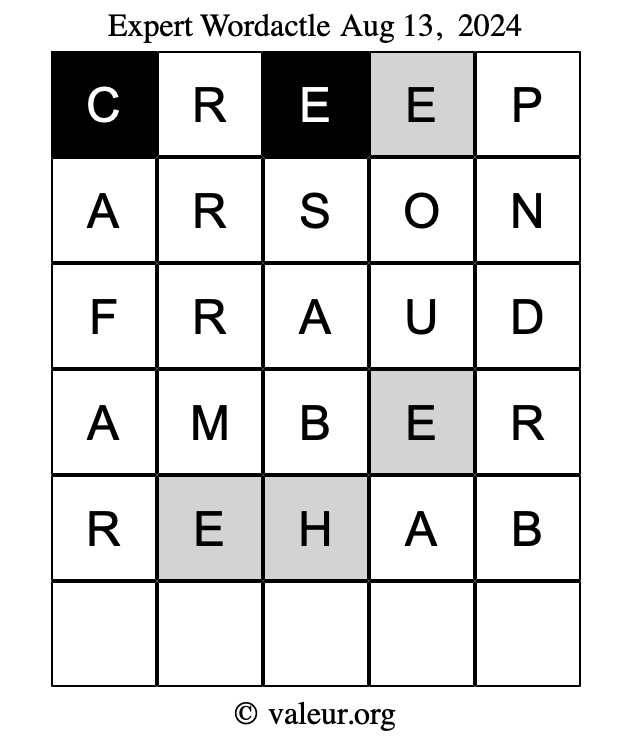 Here are the August 13, 2024 daily four Wordactle puzzles. You are welcome to print a copy of the puzzles and solve them by hand. For your convenience, we have also included the solutions further down the page so you can check your work.