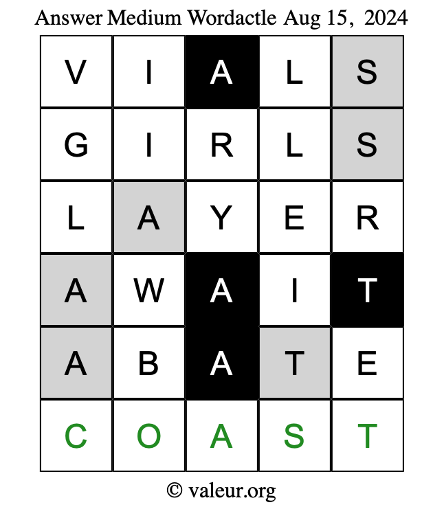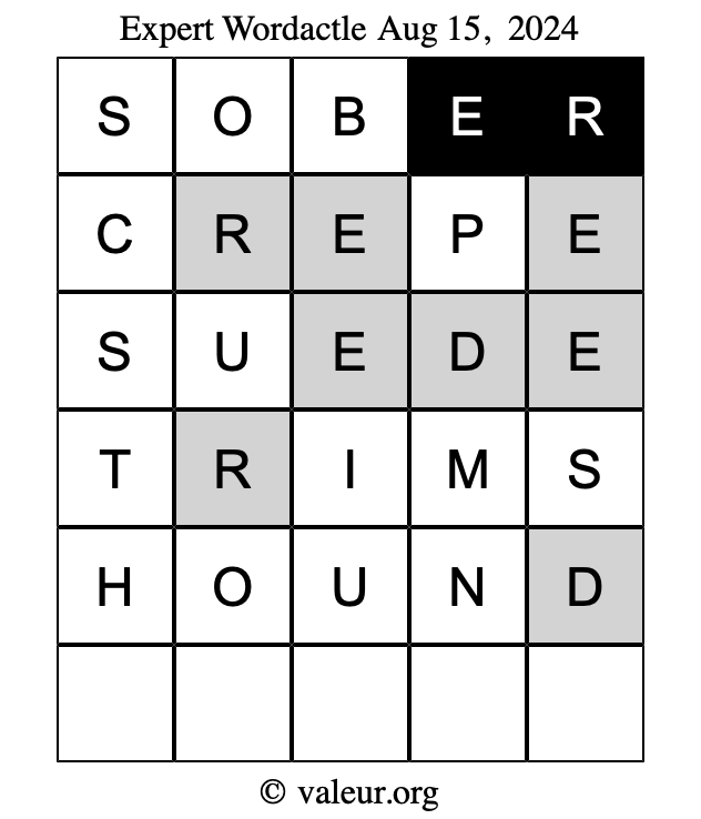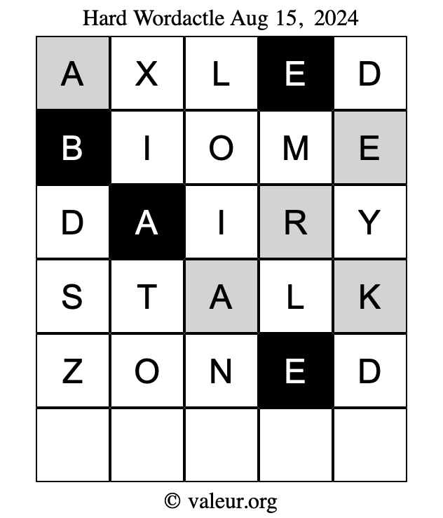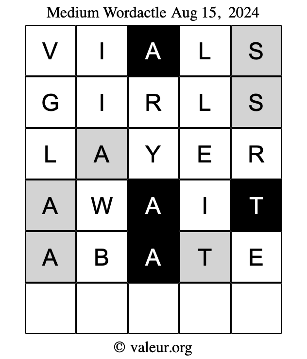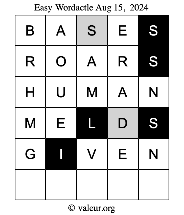 Here are the August 15, 2024 daily four Wordactle puzzles. You are welcome to print a copy of the puzzles and solve them by hand. For your convenience, we have also included the solutions further down the page so you can check your work.
