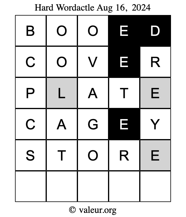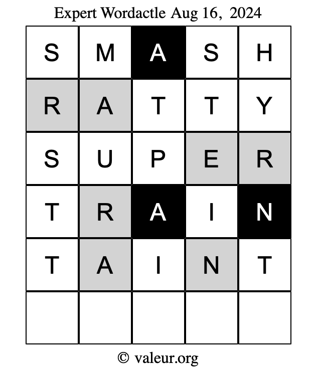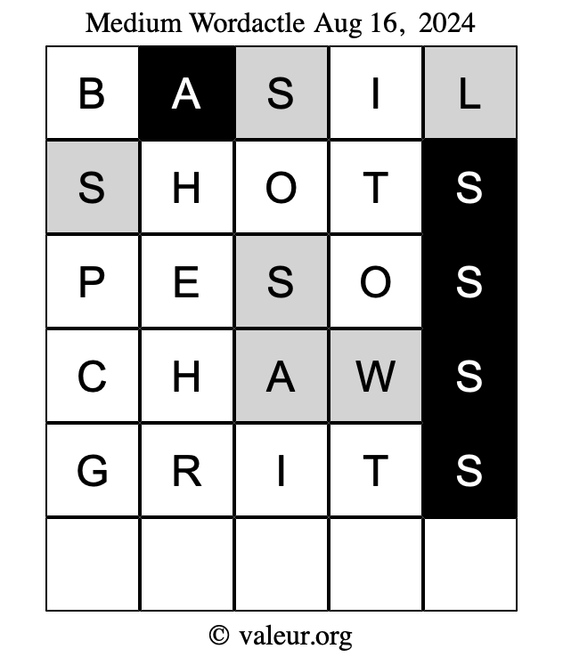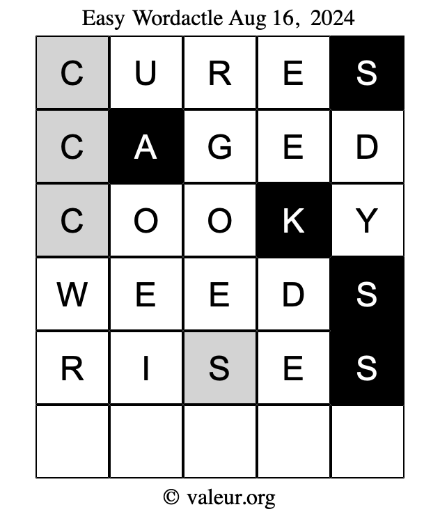 Here are the August 16, 2024 daily four Wordactle puzzles. You are welcome to print a copy of the puzzles and solve them by hand. For your convenience, we have also included the solutions further down the page so you can check your work.