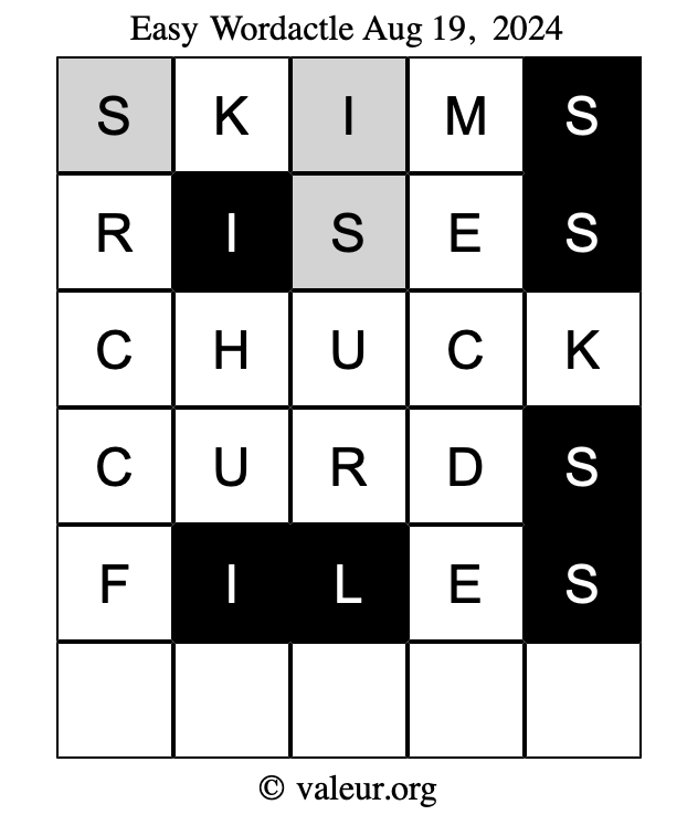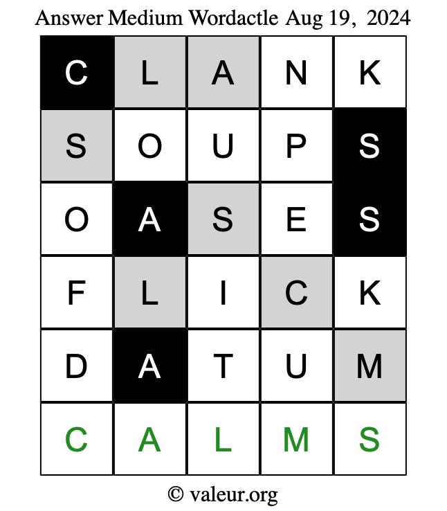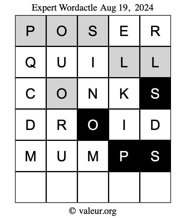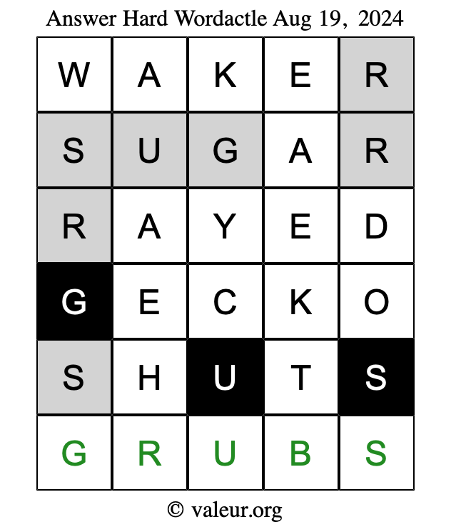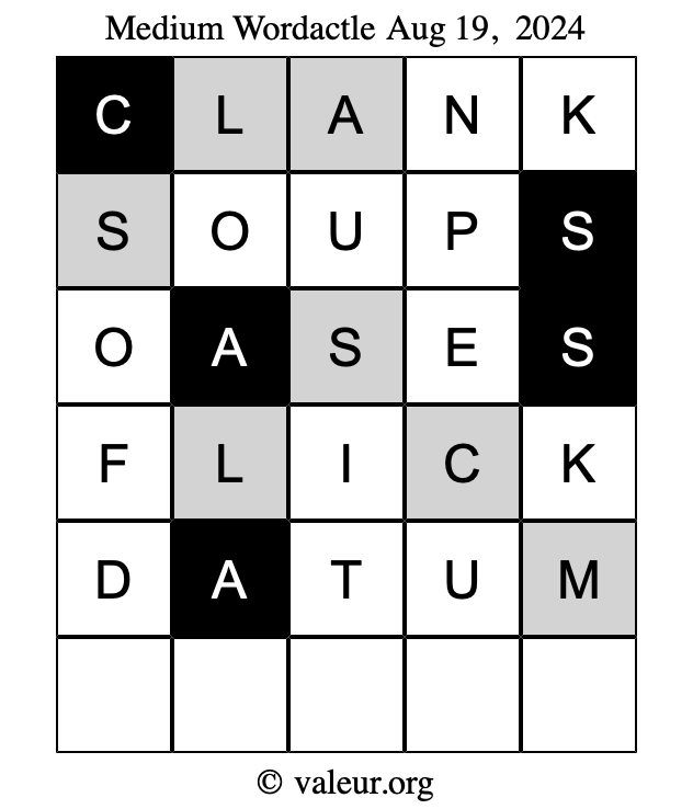 Here are the August 19, 2024 daily four Wordactle puzzles. You are welcome to print a copy of the puzzles and solve them by hand. For your convenience, we have also included the solutions further down the page so you can check your work.