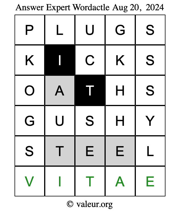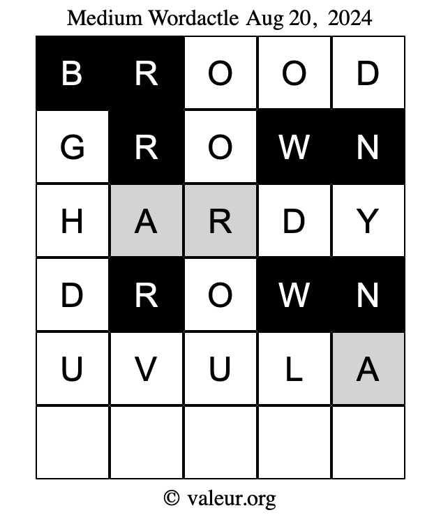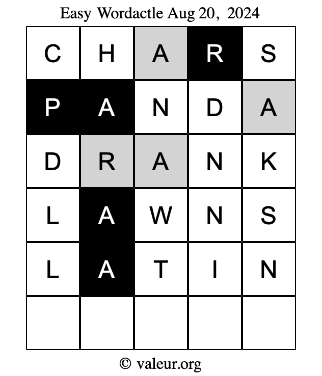 Here are the August 20, 2024 daily four Wordactle puzzles. You are welcome to print a copy of the puzzles and solve them by hand. For your convenience, we have also included the solutions further down the page so you can check your work.