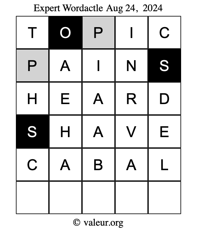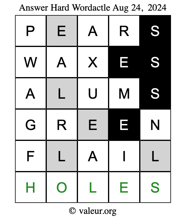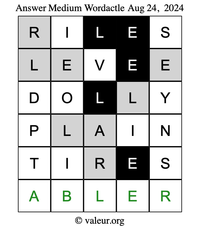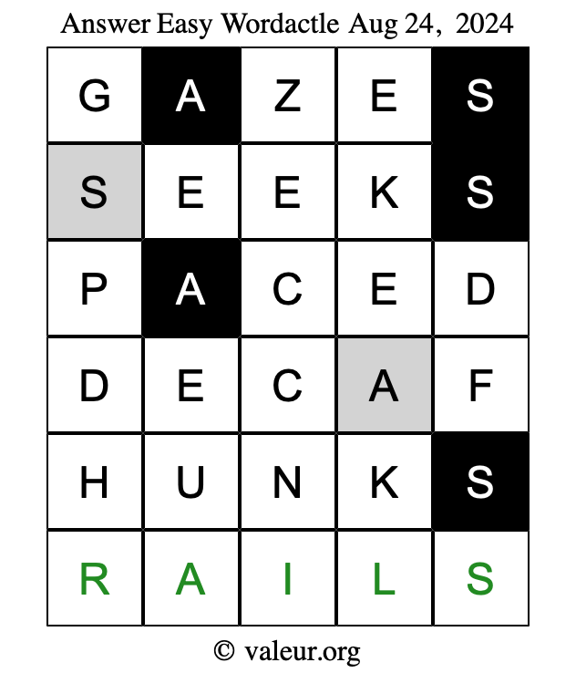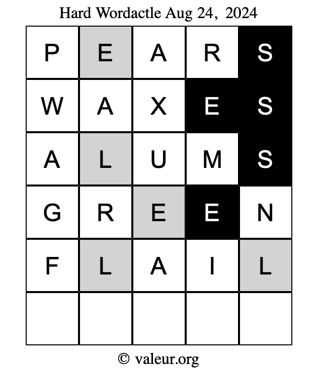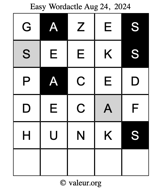 Here are the August 24, 2024 daily four Wordactle puzzles. You are welcome to print a copy of the puzzles and solve them by hand. For your convenience, we have also included the solutions further down the page so you can check your work.
