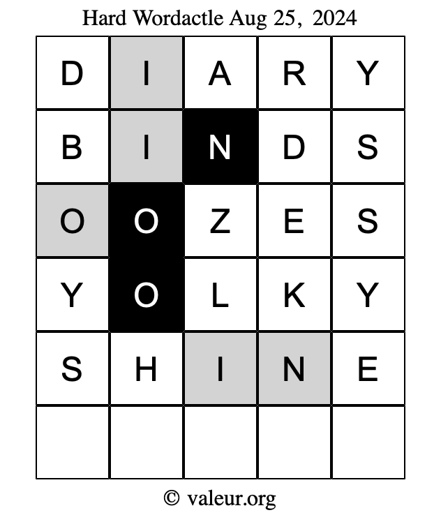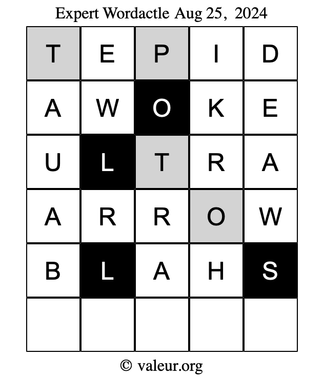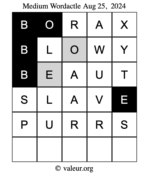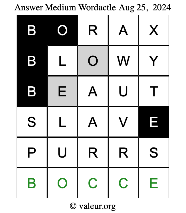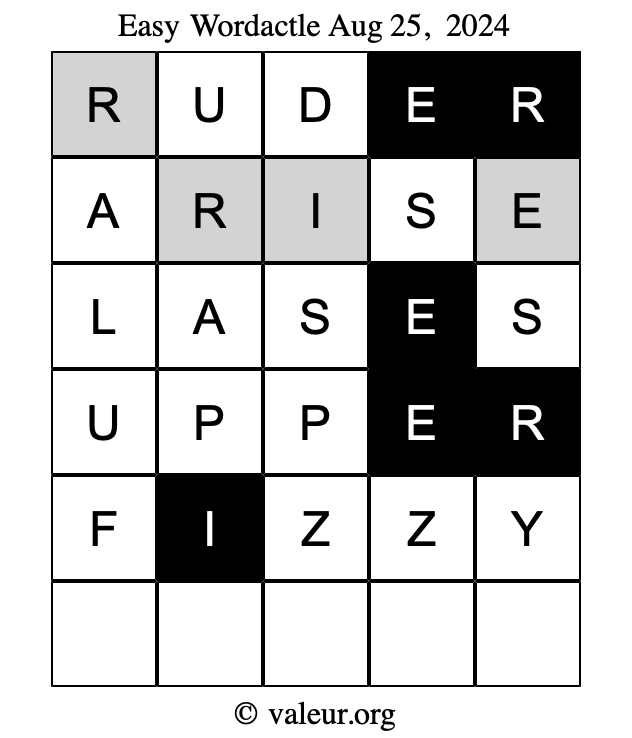 Here are the August 25, 2024 daily four Wordactle puzzles. You are welcome to print a copy of the puzzles and solve them by hand. For your convenience, we have also included the solutions further down the page so you can check your work.
