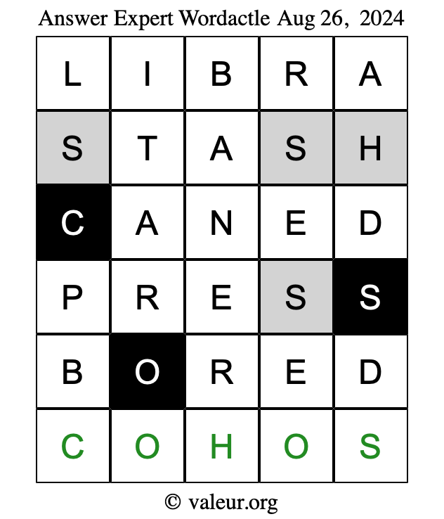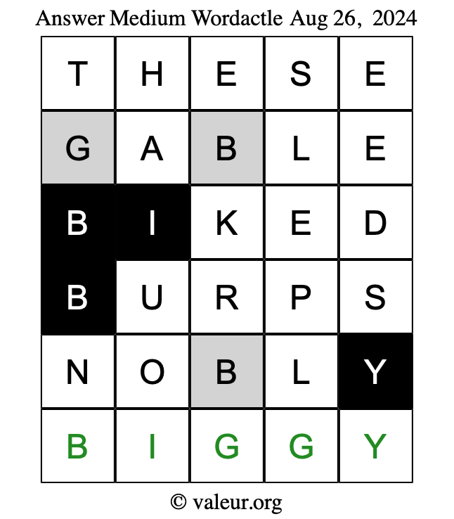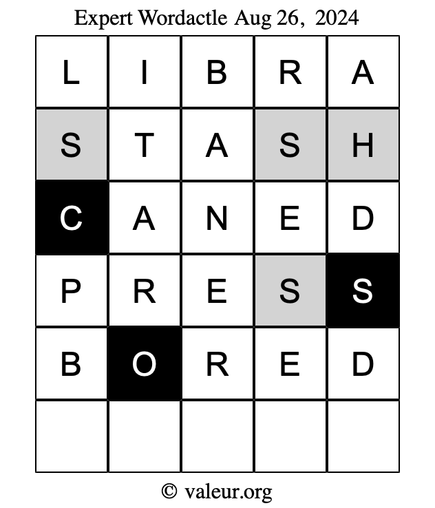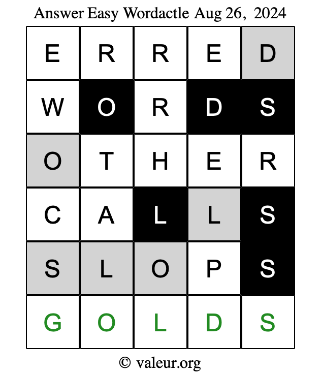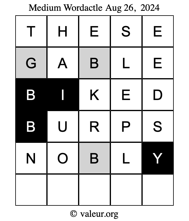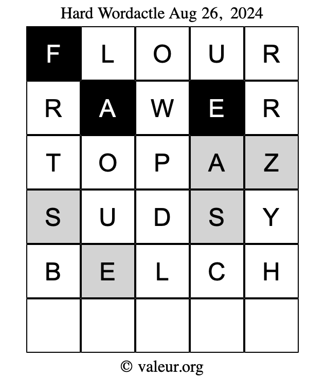 Here are the August 26, 2024 daily four Wordactle puzzles. You are welcome to print a copy of the puzzles and solve them by hand. For your convenience, we have also included the solutions further down the page so you can check your work.