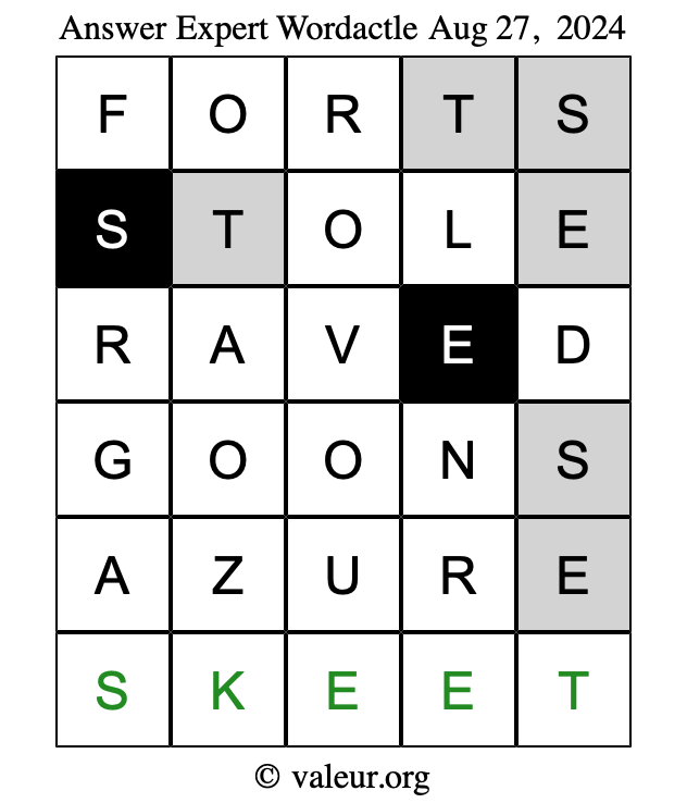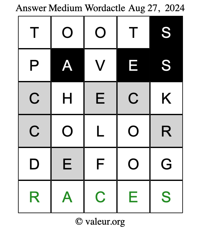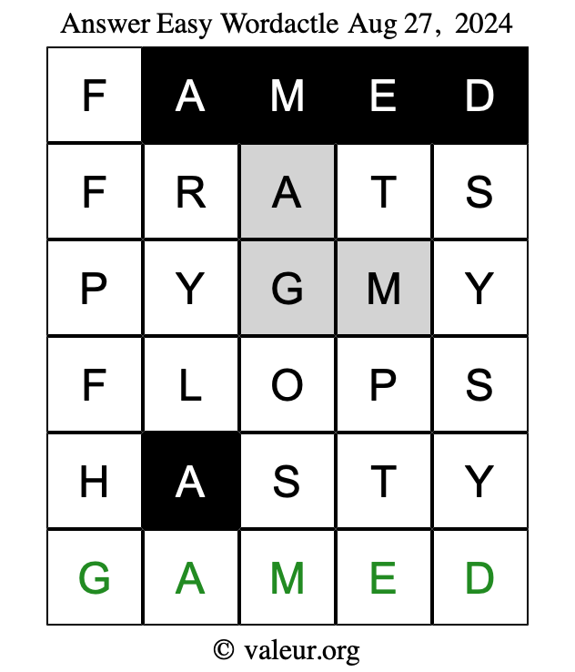 Here are the August 27, 2024 daily four Wordactle puzzles. You are welcome to print a copy of the puzzles and solve them by hand. For your convenience, we have also included the solutions further down the page so you can check your work.