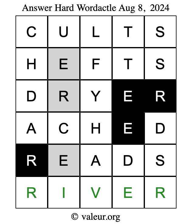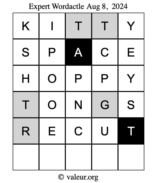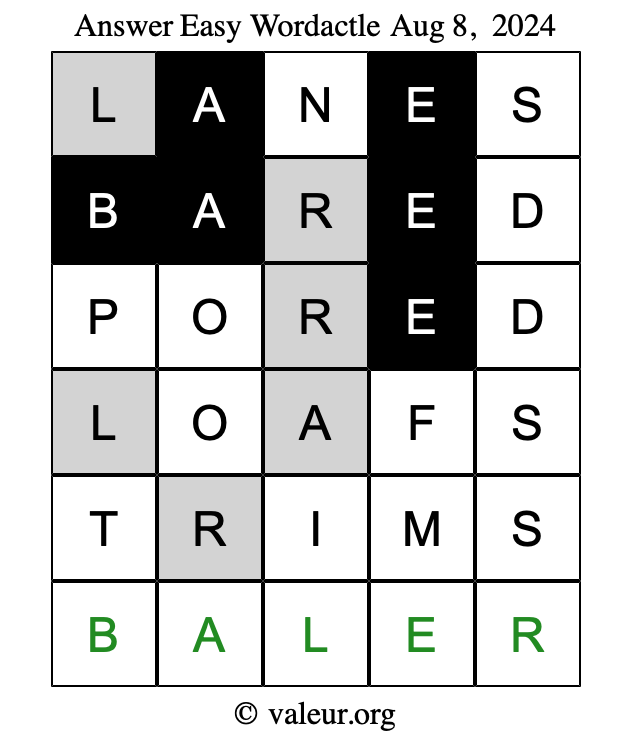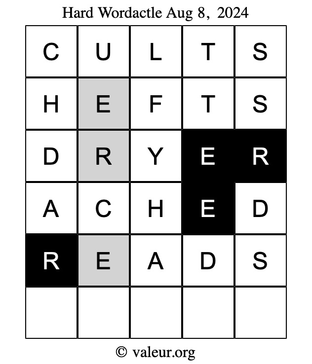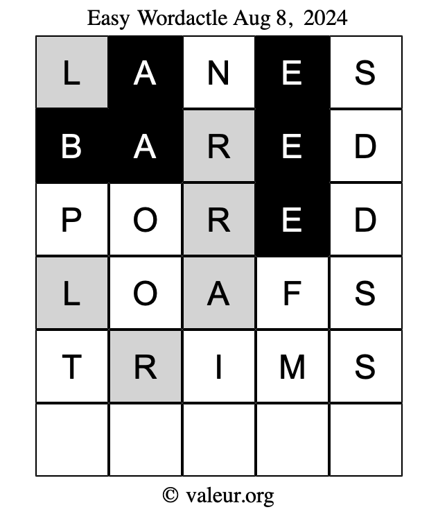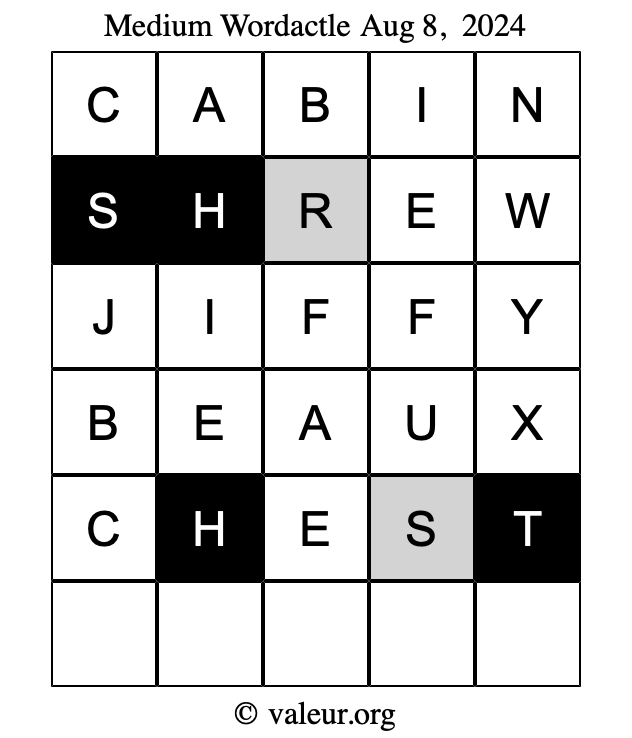 Here are the August 8, 2024 daily four Wordactle puzzles. You are welcome to print a copy of the puzzles and solve them by hand. For your convenience, we have also included the solutions further down the page so you can check your work.