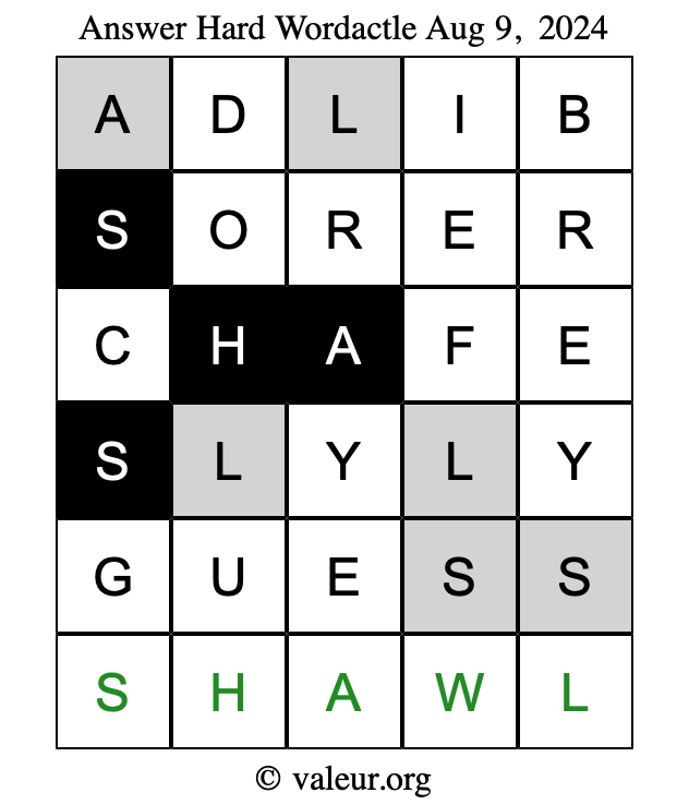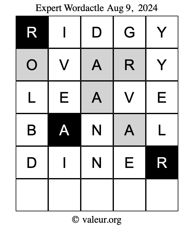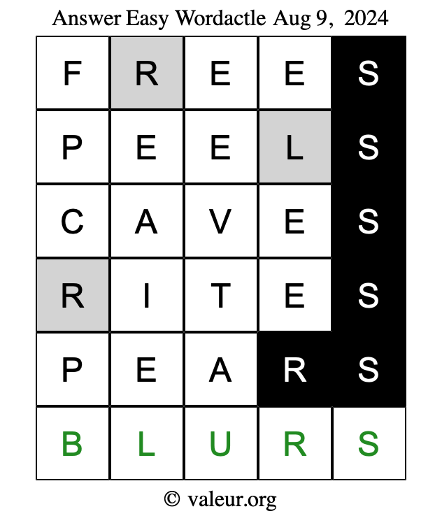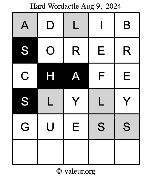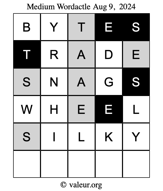Here are the August 9, 2024 daily four Wordactle puzzles. You are welcome to print a copy of the puzzles and solve them by hand. For your convenience, we have also included the solutions further down the page so you can check your work.