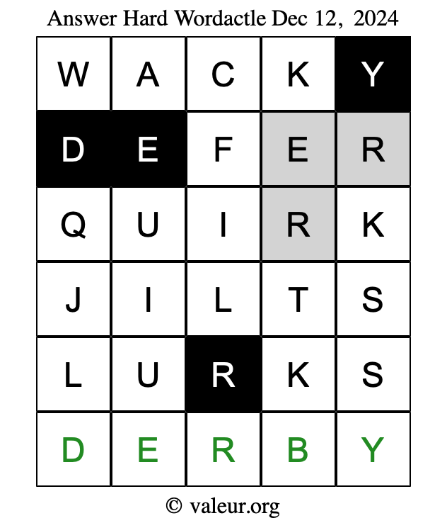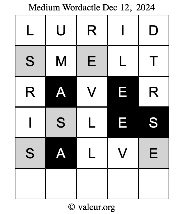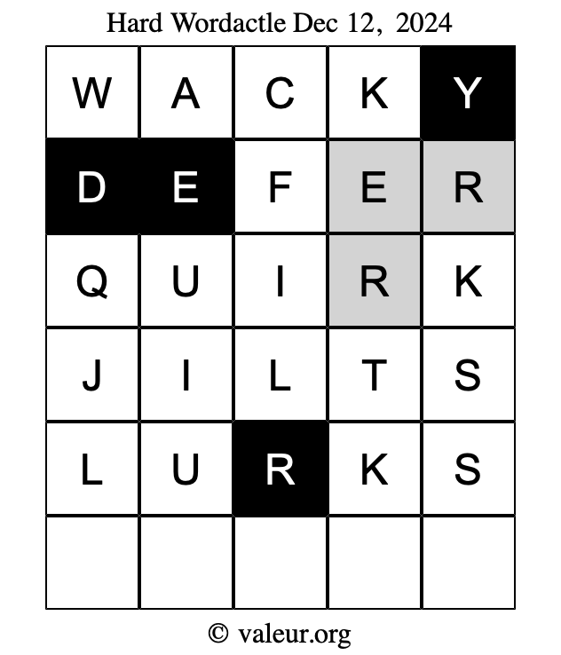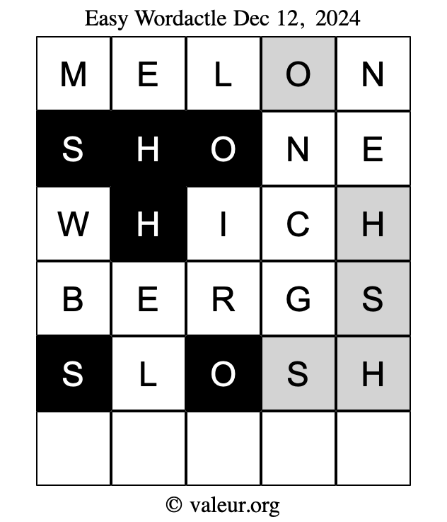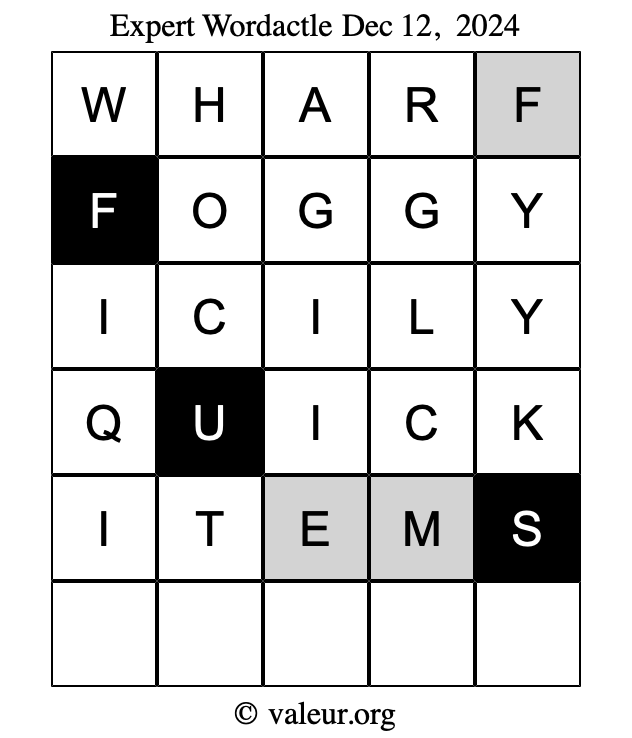 Here are the December 12, 2024 daily four Wordactle puzzles. You are welcome to print a copy of the puzzles and solve them by hand. For your convenience, we have also included the solutions further down the page so you can check your work.