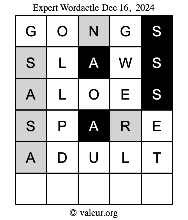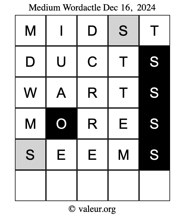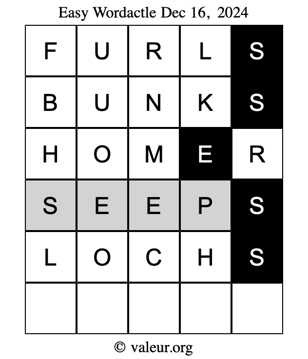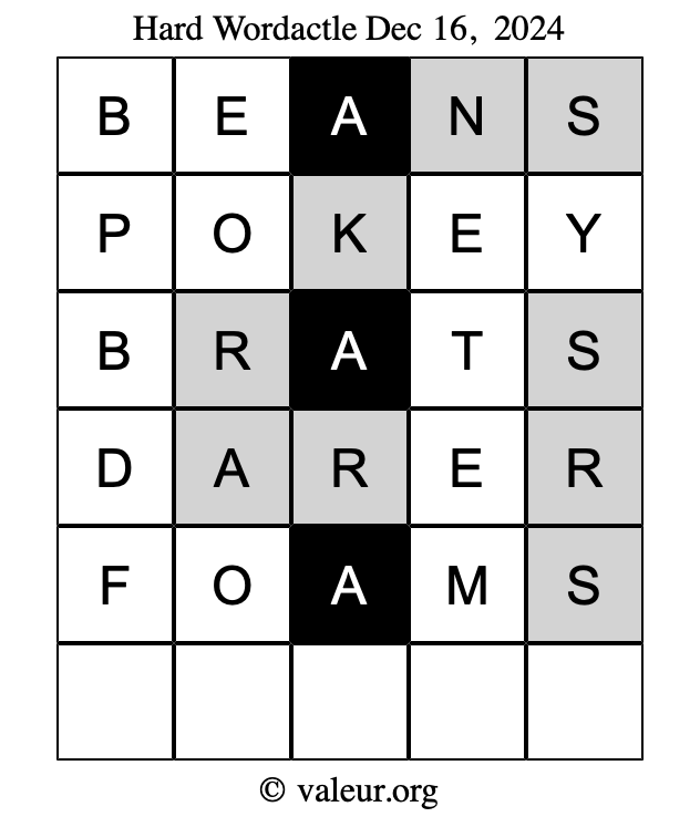 Here are the December 16, 2024 daily four Wordactle puzzles. You are welcome to print a copy of the puzzles and solve them by hand. For your convenience, we have also included the solutions further down the page so you can check your work.