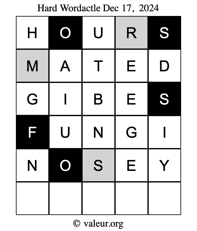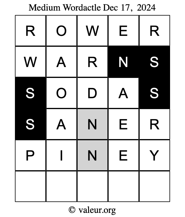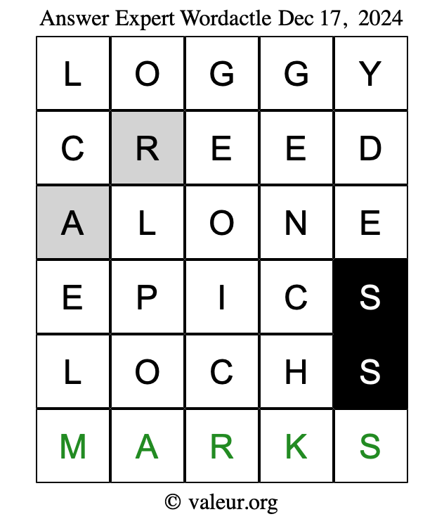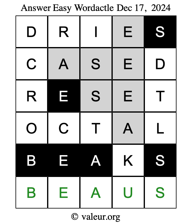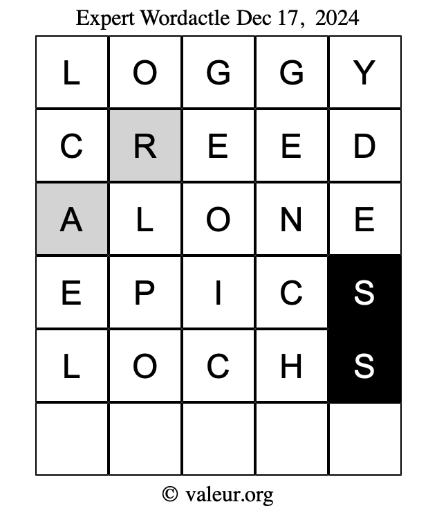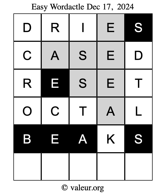 Here are the December 17, 2024 daily four Wordactle puzzles. You are welcome to print a copy of the puzzles and solve them by hand. For your convenience, we have also included the solutions further down the page so you can check your work.