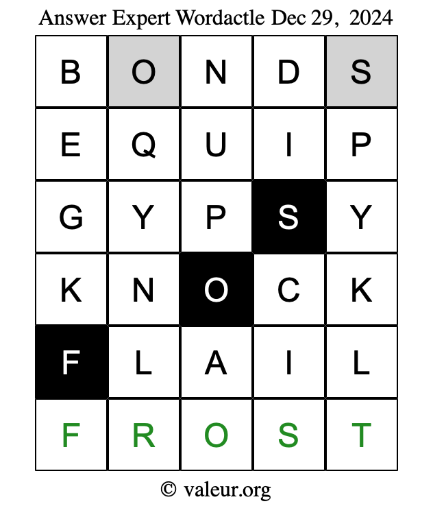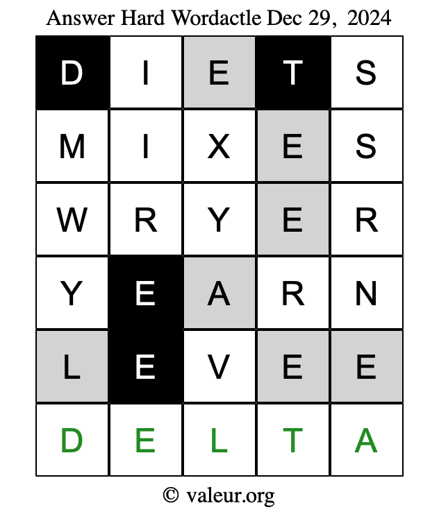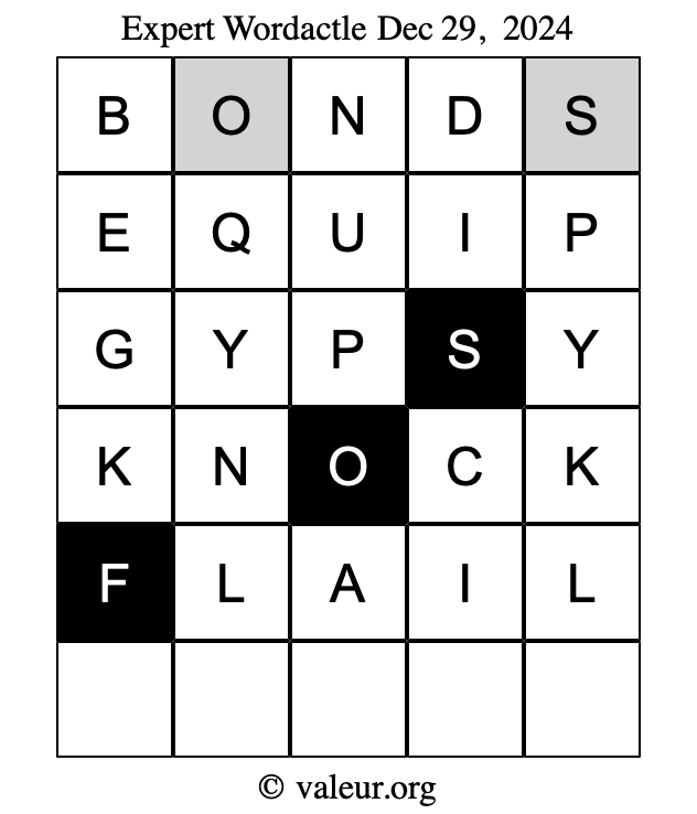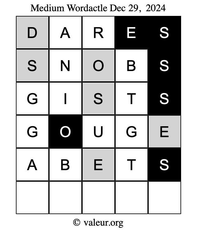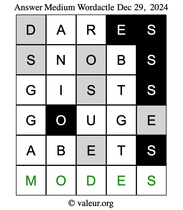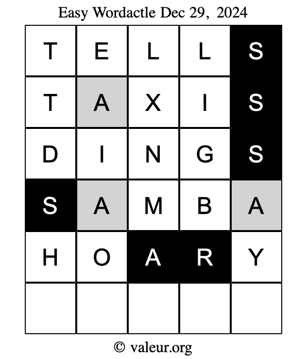 Here are the December 29, 2024 daily four Wordactle puzzles. You are welcome to print a copy of the puzzles and solve them by hand. For your convenience, we have also included the solutions further down the page so you can check your work.