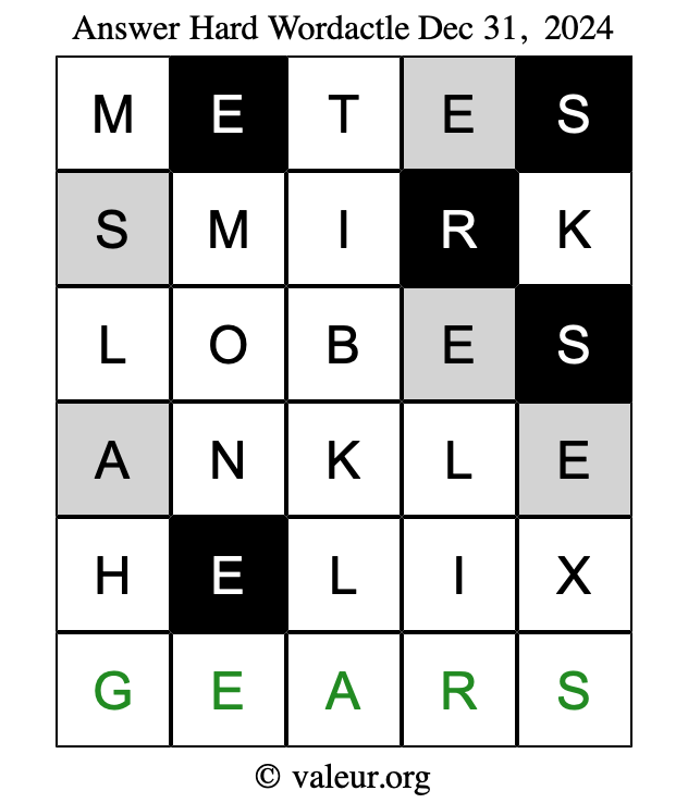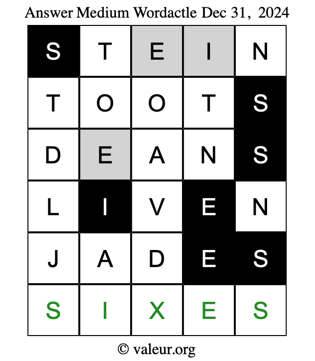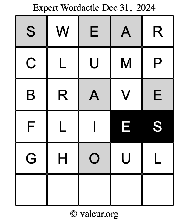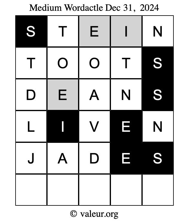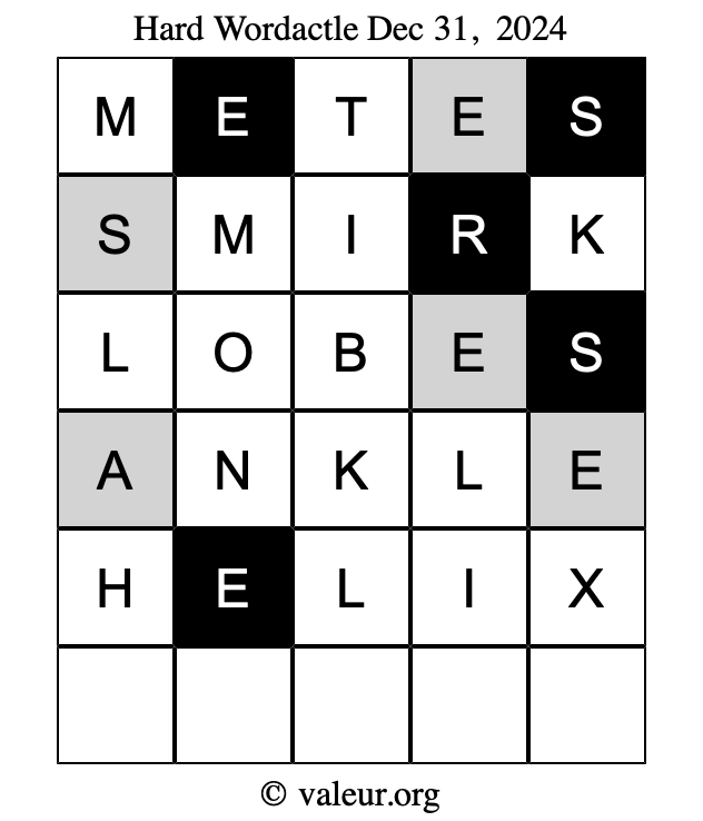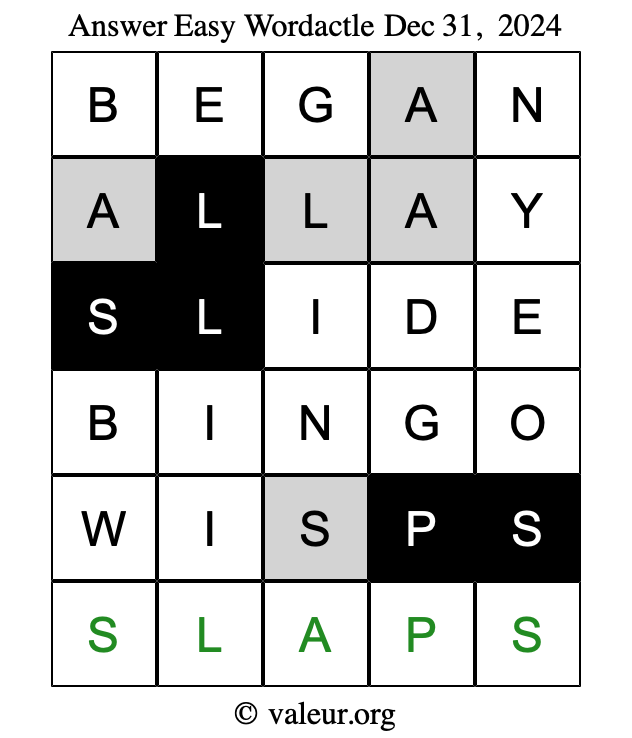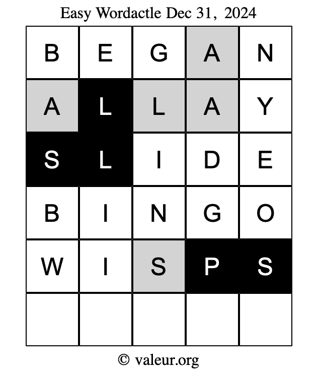 Here are the December 31, 2024 daily four Wordactle puzzles. You are welcome to print a copy of the puzzles and solve them by hand. For your convenience, we have also included the solutions further down the page so you can check your work.