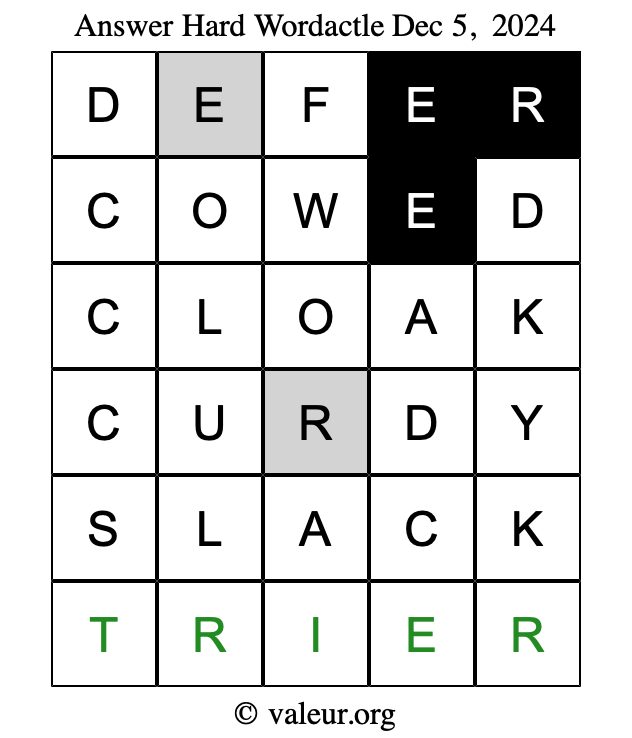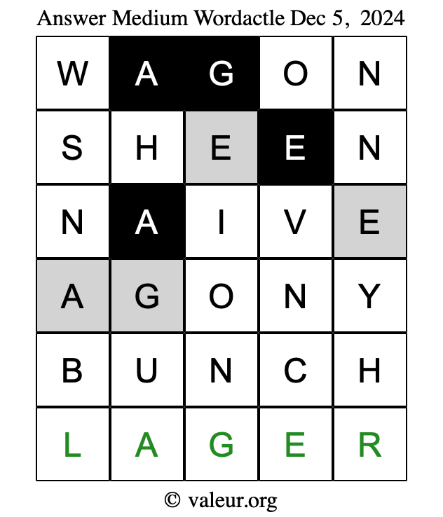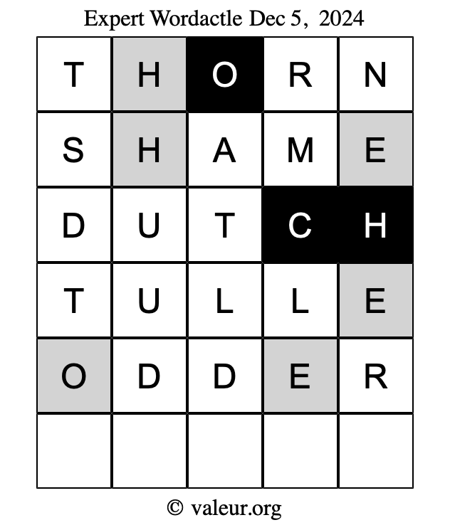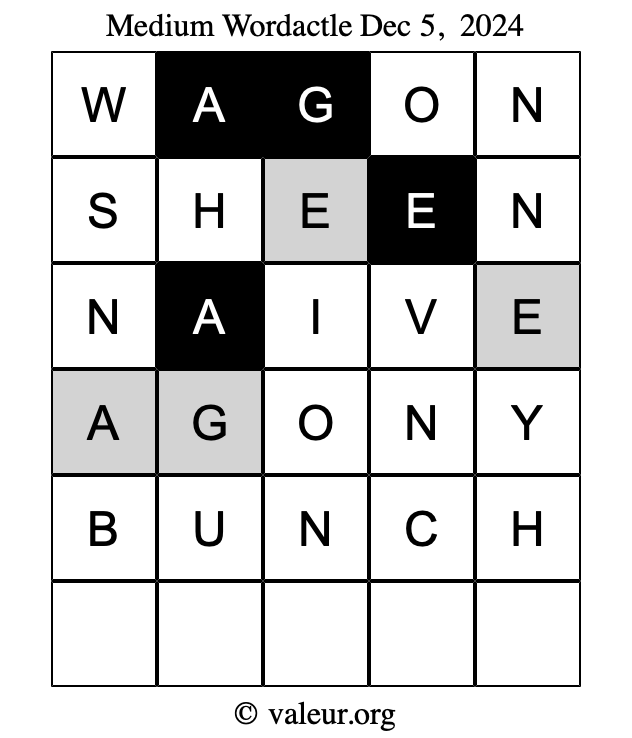 Here are the December 5, 2024 daily four Wordactle puzzles. You are welcome to print a copy of the puzzles and solve them by hand. For your convenience, we have also included the solutions further down the page so you can check your work.