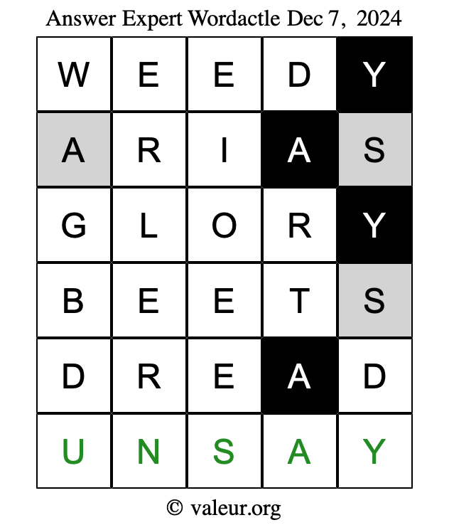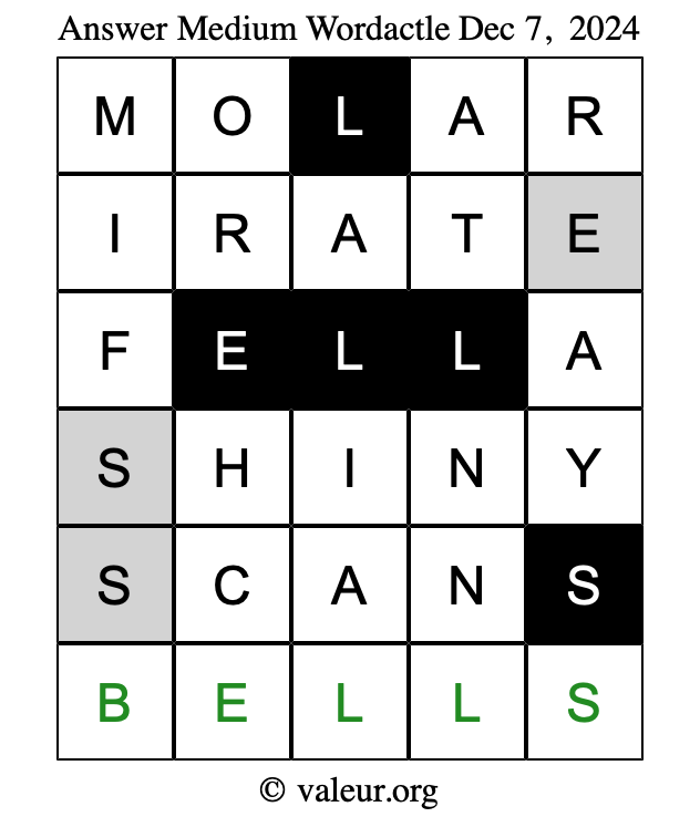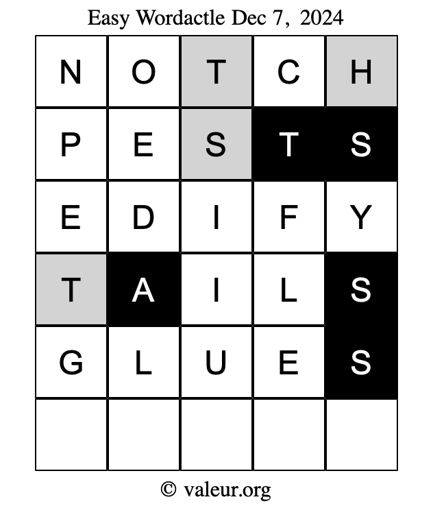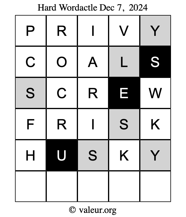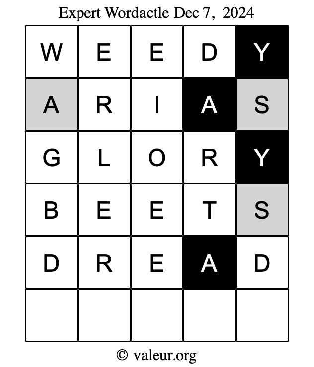Here are the December 7, 2024 daily four Wordactle puzzles. You are welcome to print a copy of the puzzles and solve them by hand. For your convenience, we have also included the solutions further down the page so you can check your work.