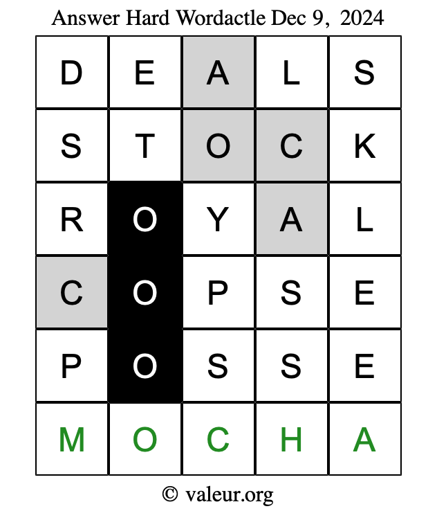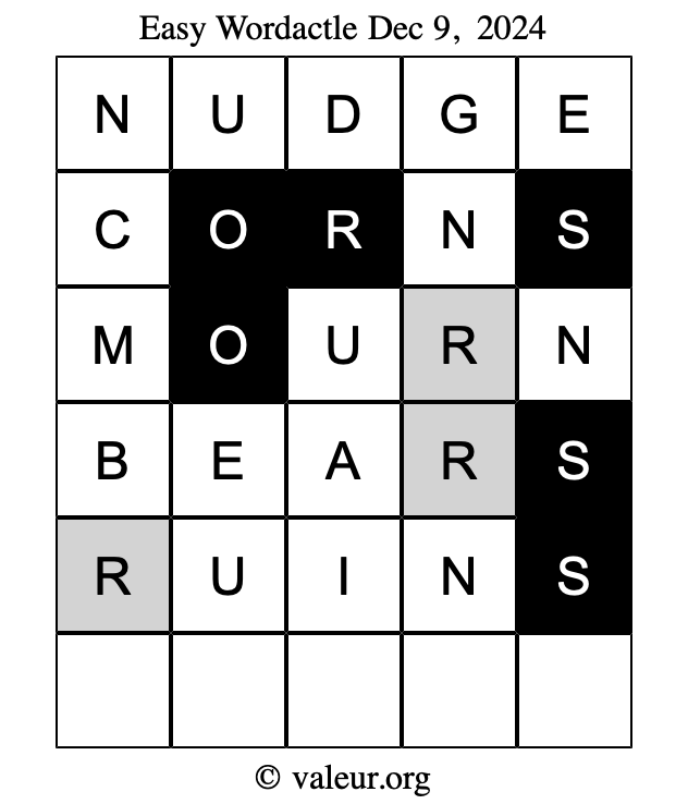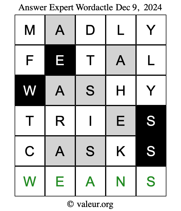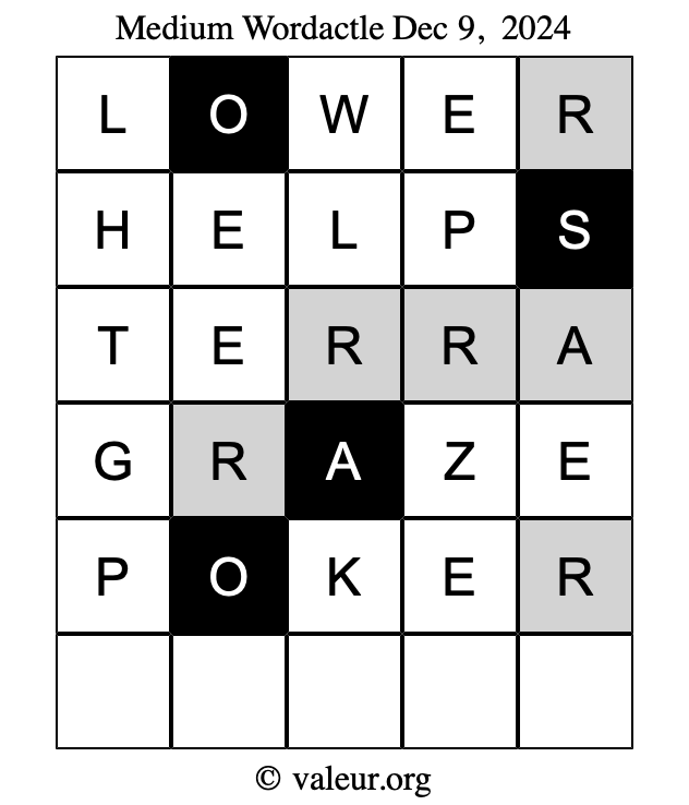Here are the December 9, 2024 daily four Wordactle puzzles. You are welcome to print a copy of the puzzles and solve them by hand. For your convenience, we have also included the solutions further down the page so you can check your work.