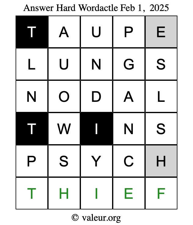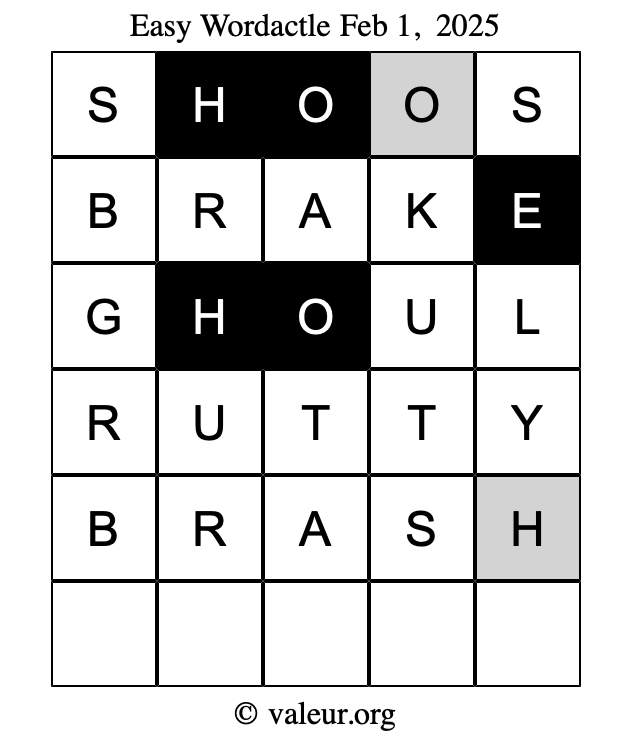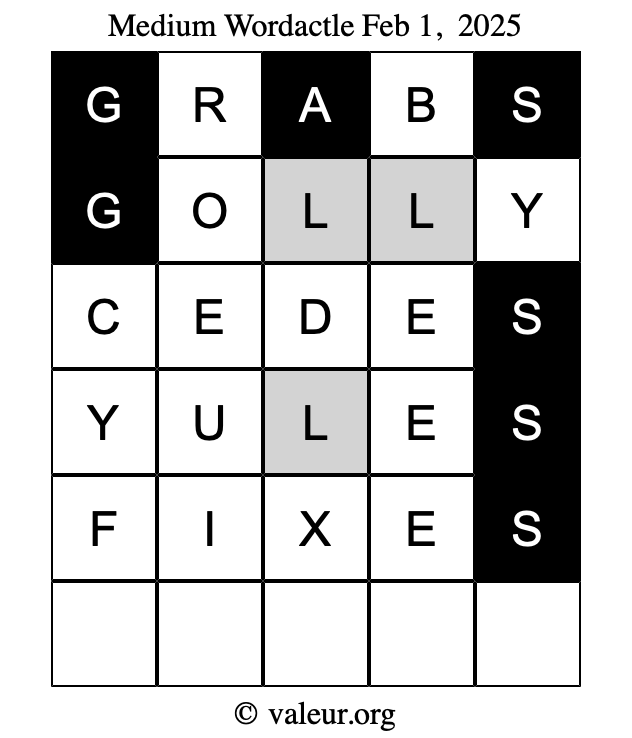 Here are the February 1, 2025 daily four Wordactle puzzles. You are welcome to print a copy of the puzzles and solve them by hand. For your convenience, we have also included the solutions further down the page so you can check your work.