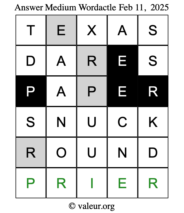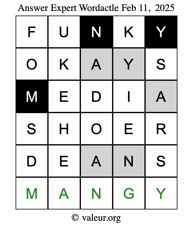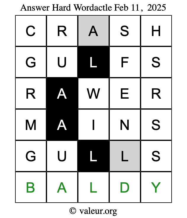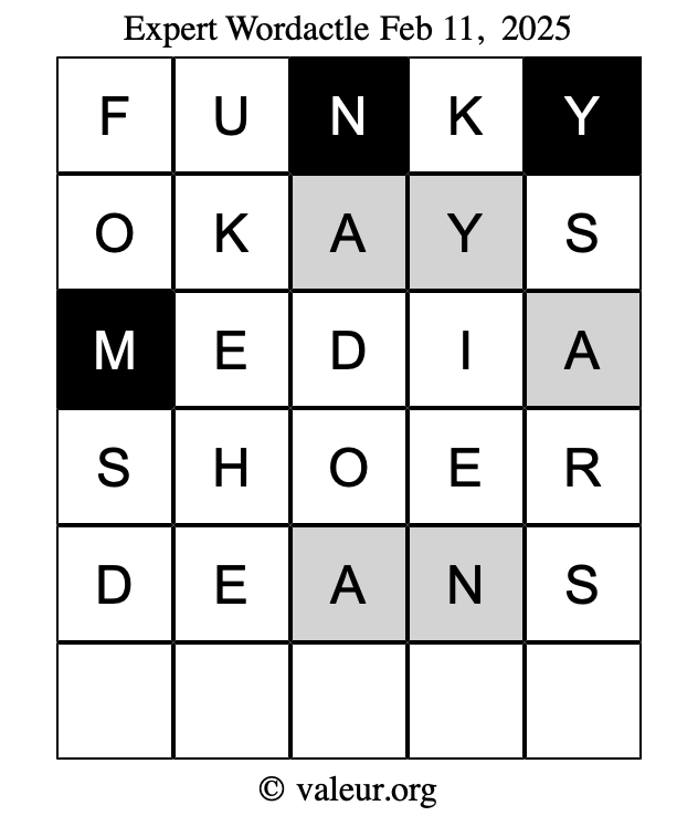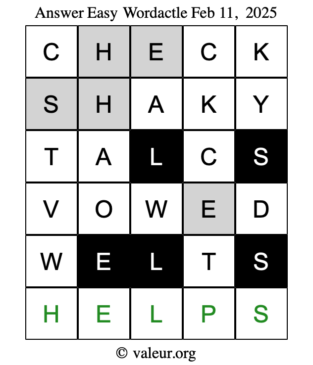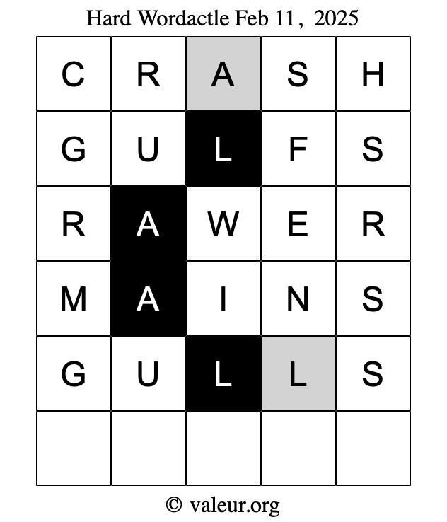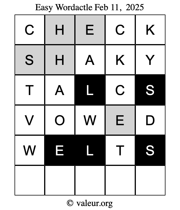 Here are the February 11, 2025 daily four Wordactle puzzles. You are welcome to print a copy of the puzzles and solve them by hand. For your convenience, we have also included the solutions further down the page so you can check your work.