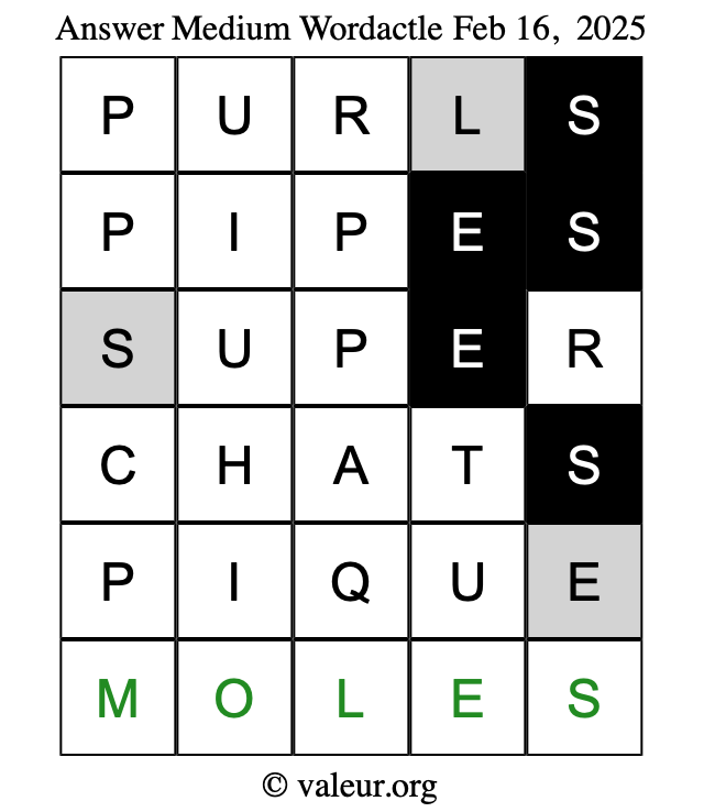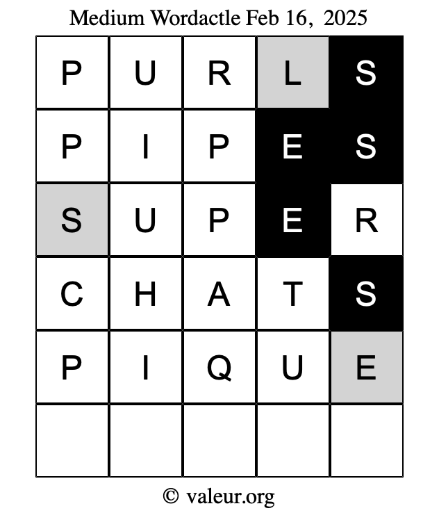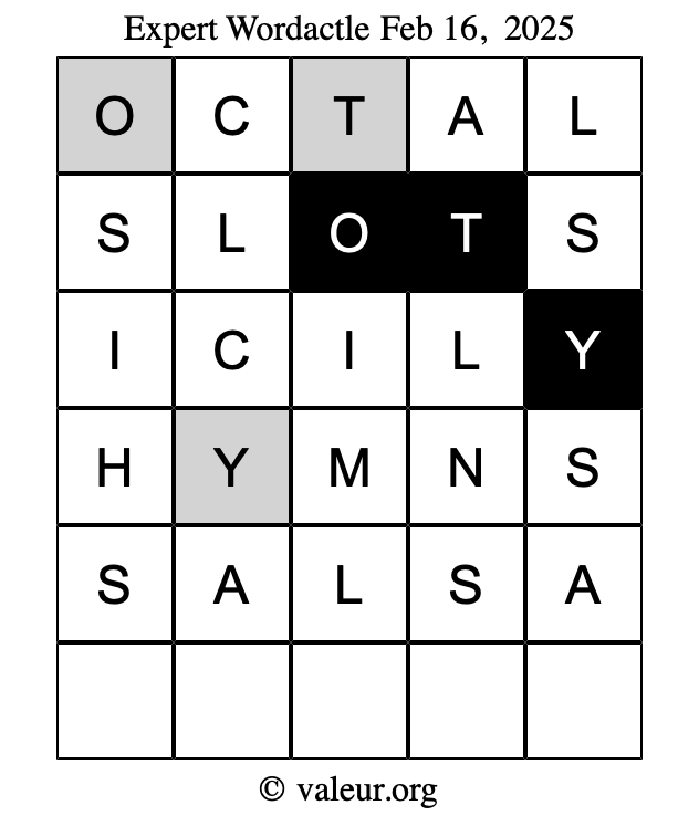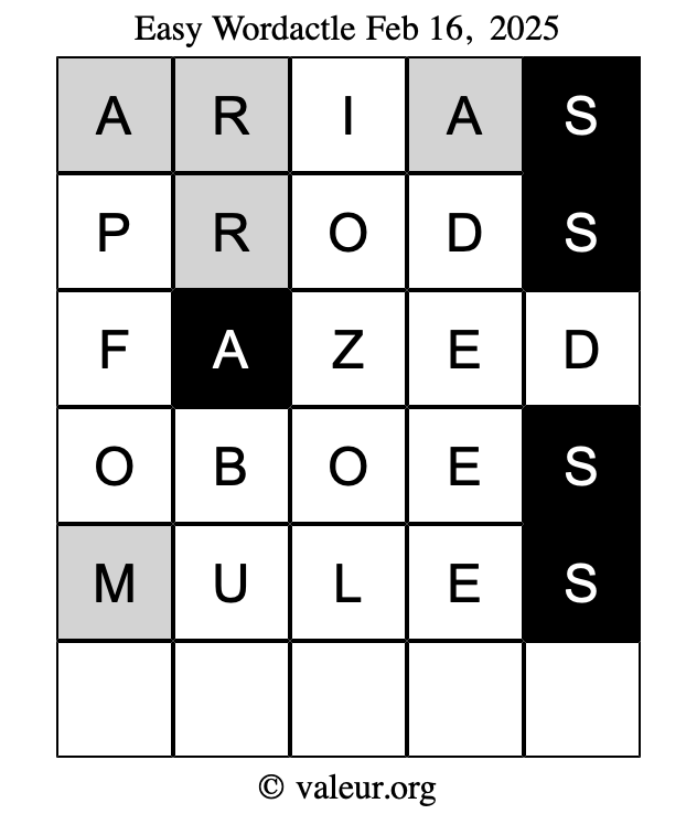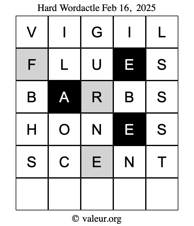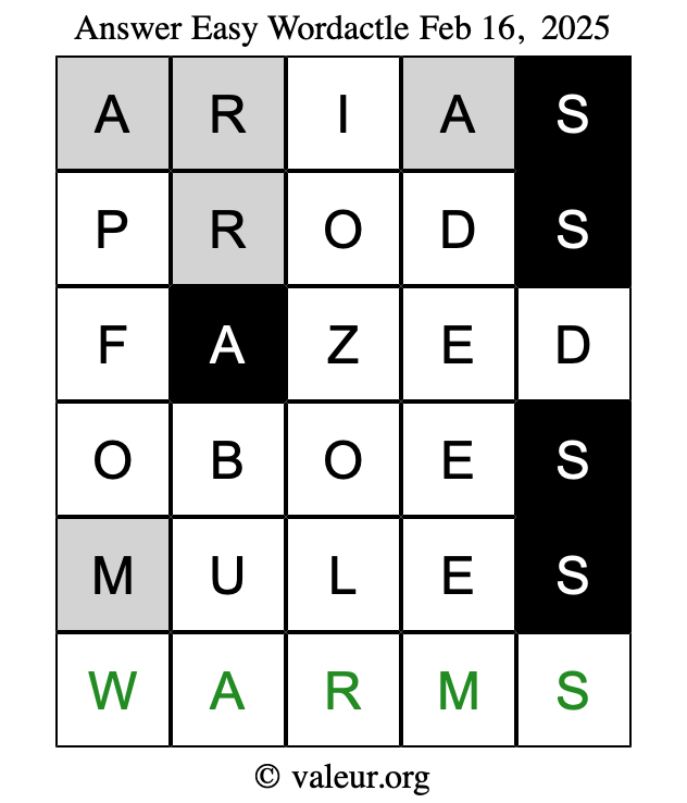 Here are the February 16, 2025 daily four Wordactle puzzles. You are welcome to print a copy of the puzzles and solve them by hand. For your convenience, we have also included the solutions further down the page so you can check your work.