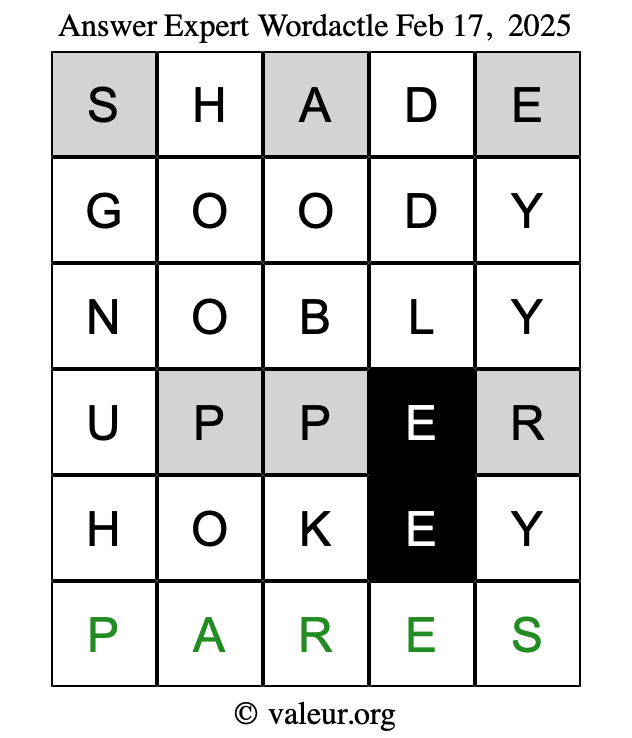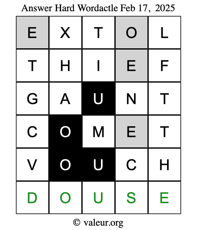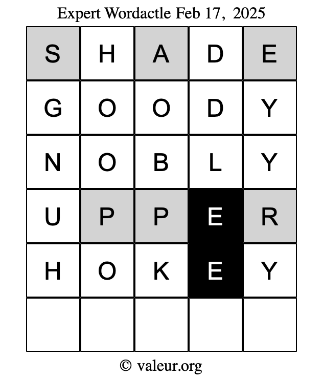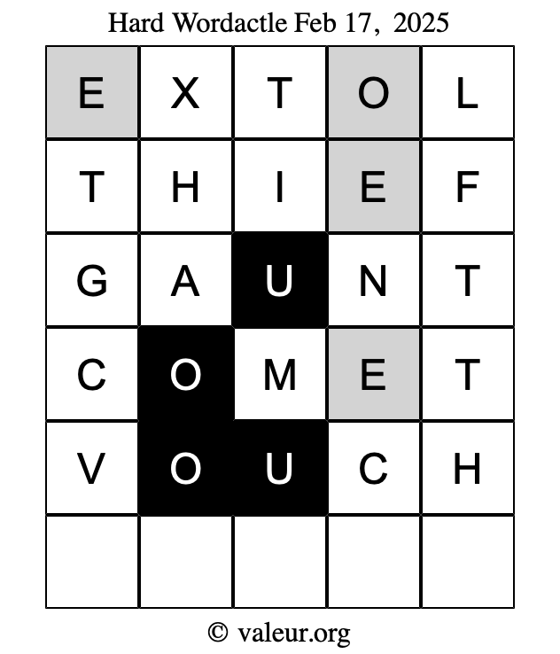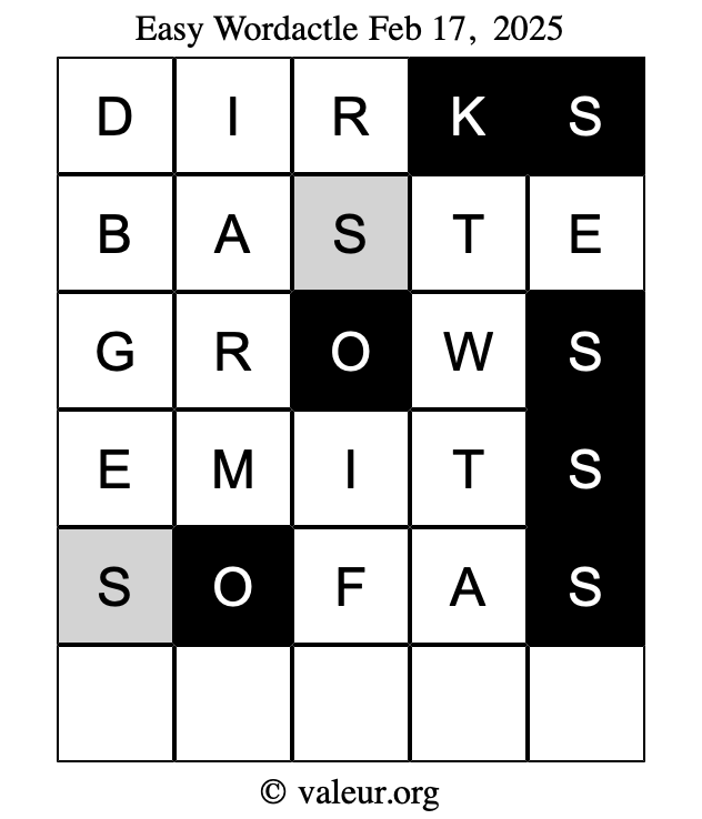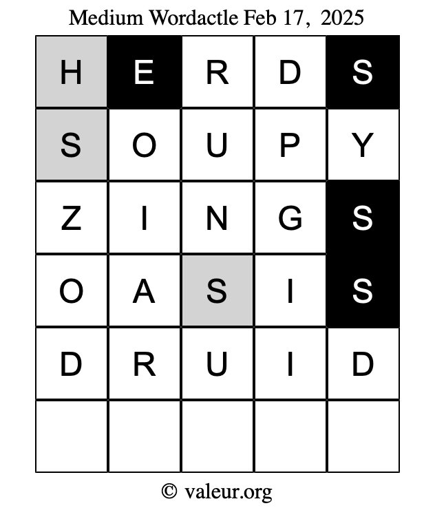 Here are the February 17, 2025 daily four Wordactle puzzles. You are welcome to print a copy of the puzzles and solve them by hand. For your convenience, we have also included the solutions further down the page so you can check your work.