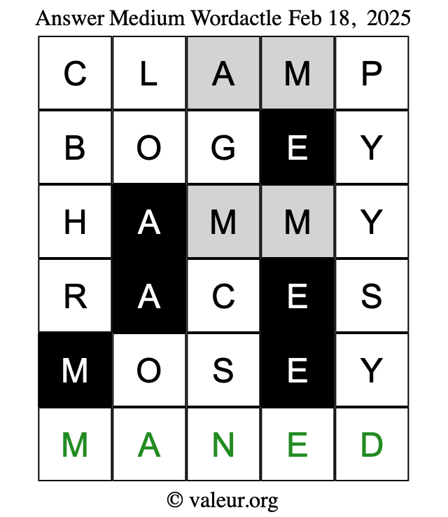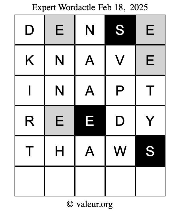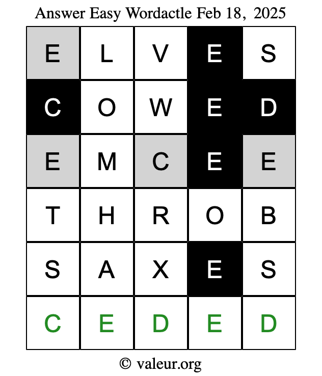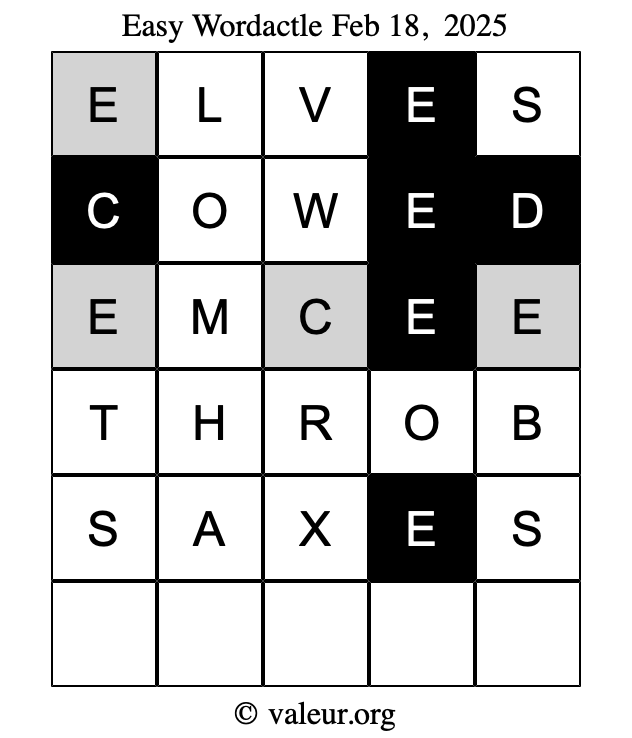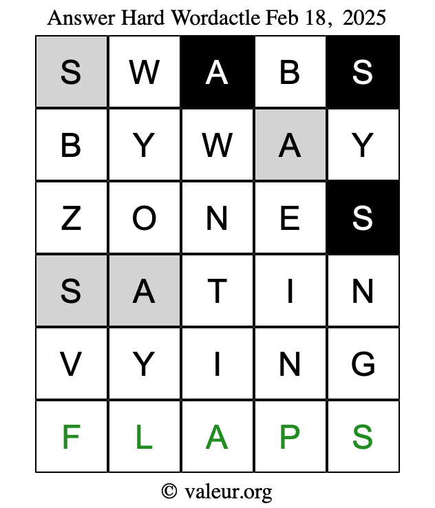 Here are the February 18, 2025 daily four Wordactle puzzles. You are welcome to print a copy of the puzzles and solve them by hand. For your convenience, we have also included the solutions further down the page so you can check your work.