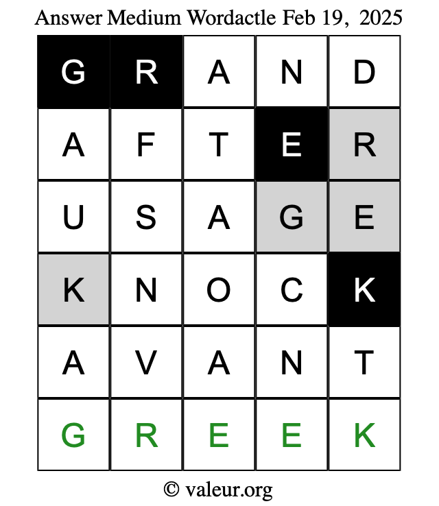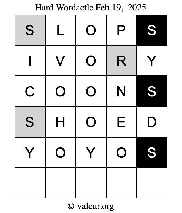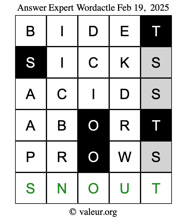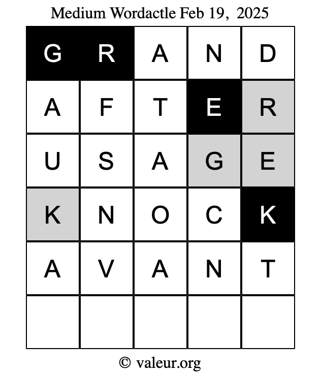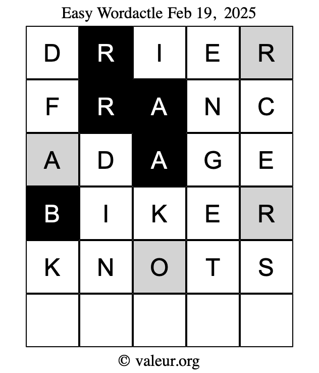 Here are the February 19, 2025 daily four Wordactle puzzles. You are welcome to print a copy of the puzzles and solve them by hand. For your convenience, we have also included the solutions further down the page so you can check your work.