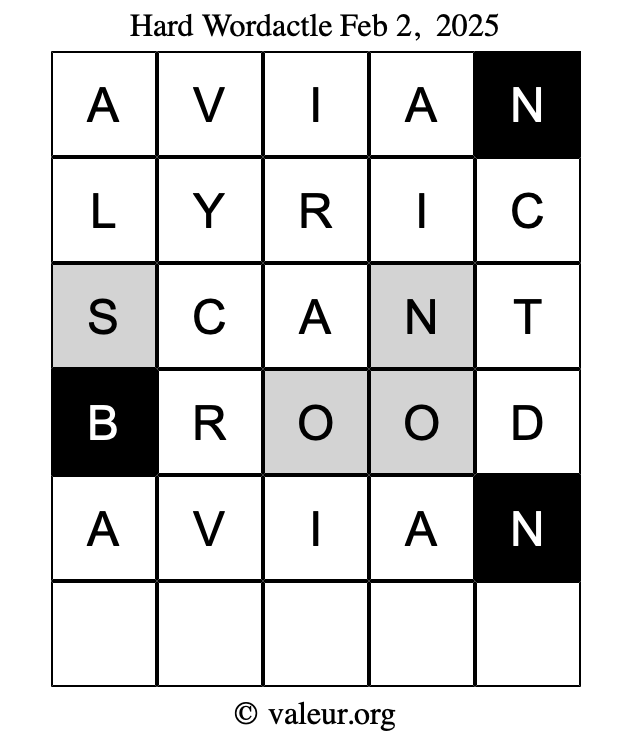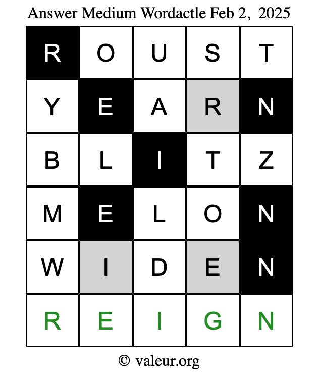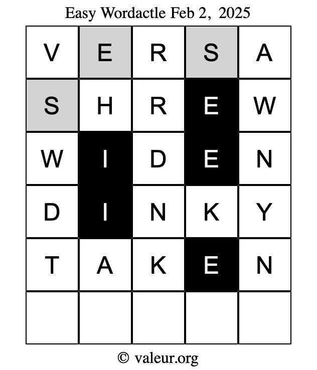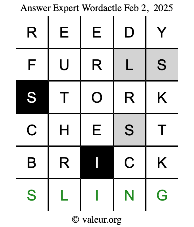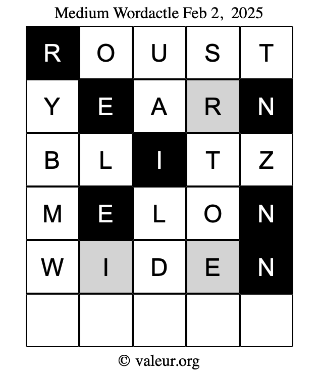 Here are the February 2, 2025 daily four Wordactle puzzles. You are welcome to print a copy of the puzzles and solve them by hand. For your convenience, we have also included the solutions further down the page so you can check your work.