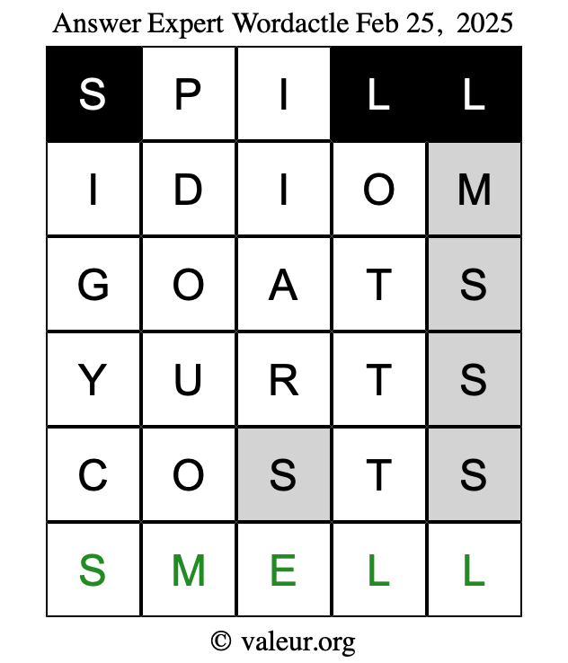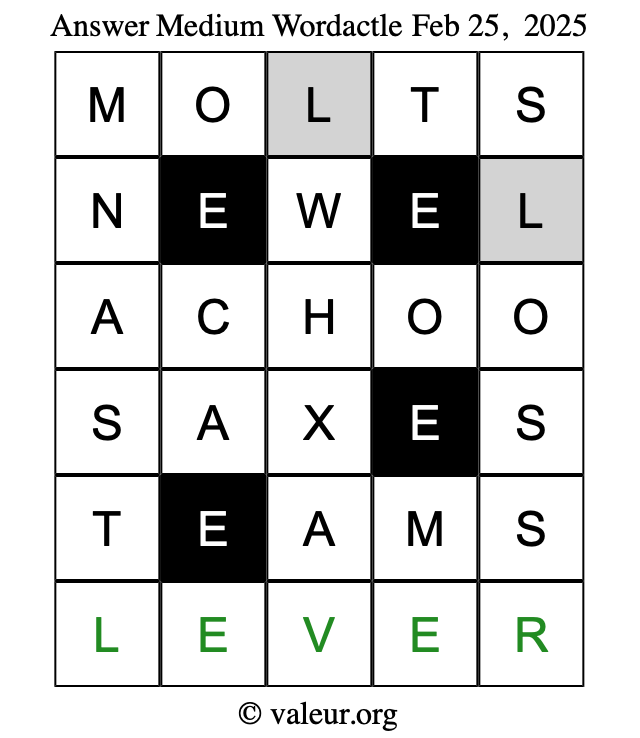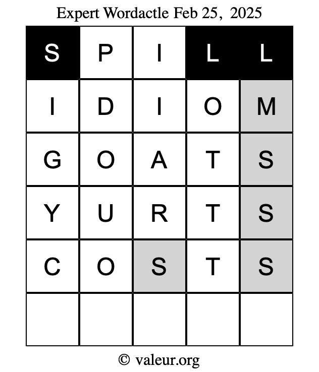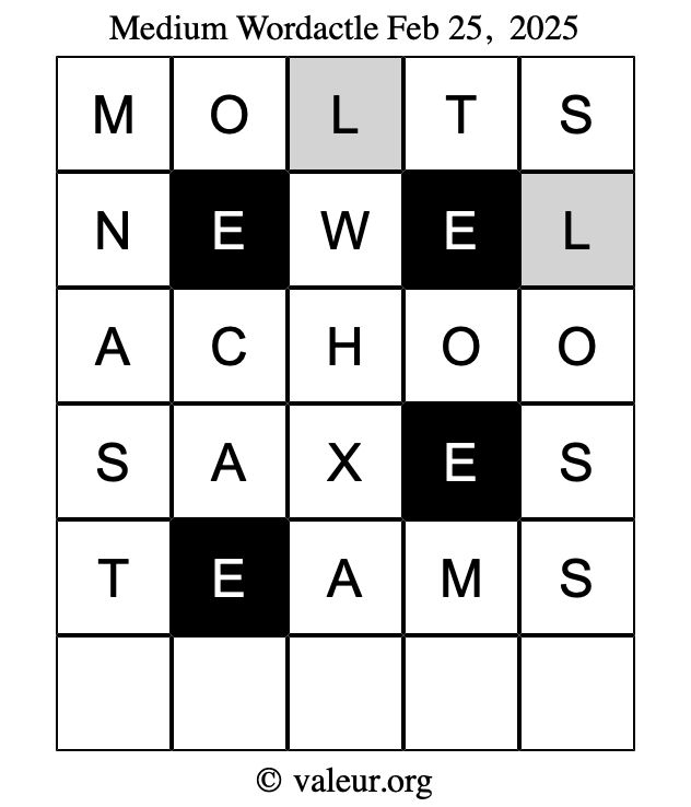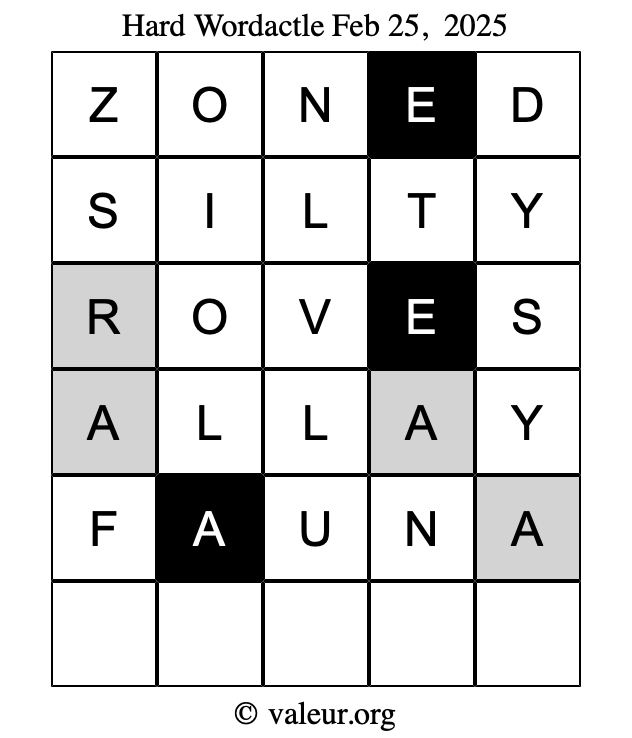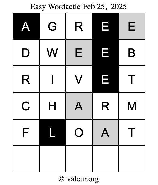 Here are the February 25, 2025 daily four Wordactle puzzles. You are welcome to print a copy of the puzzles and solve them by hand. For your convenience, we have also included the solutions further down the page so you can check your work.