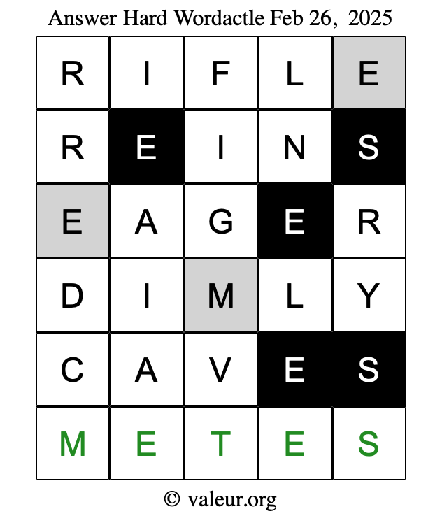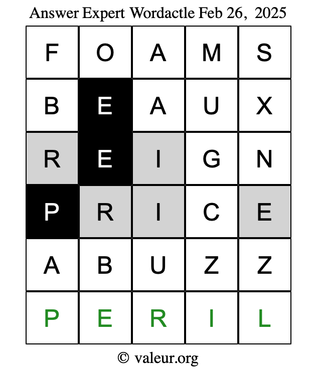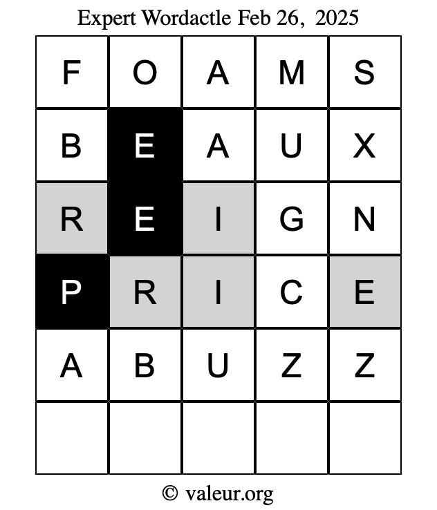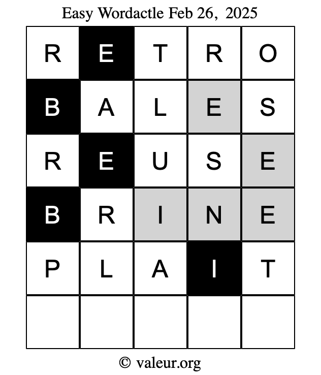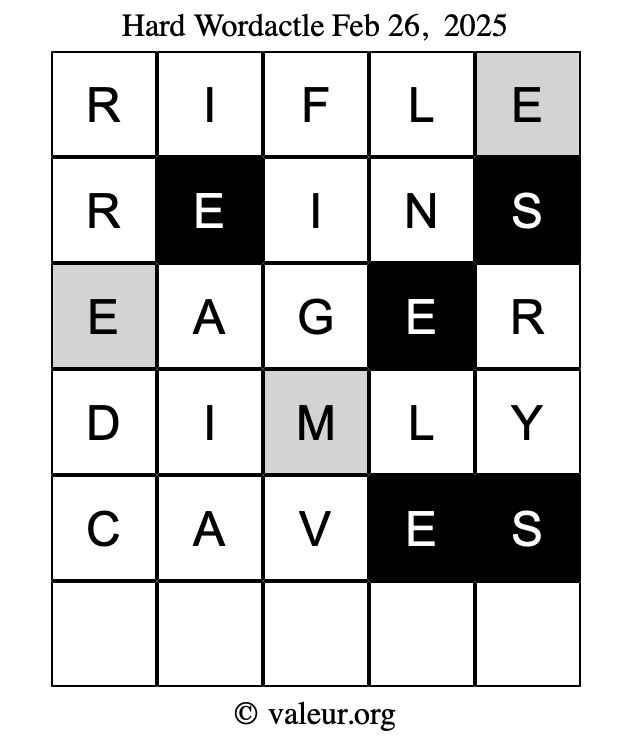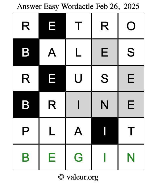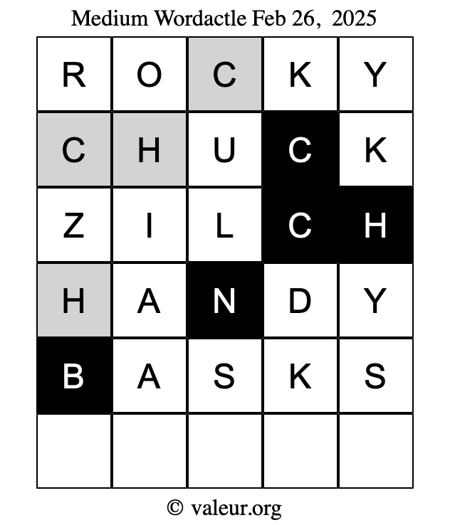 Here are the February 26, 2025 daily four Wordactle puzzles. You are welcome to print a copy of the puzzles and solve them by hand. For your convenience, we have also included the solutions further down the page so you can check your work.