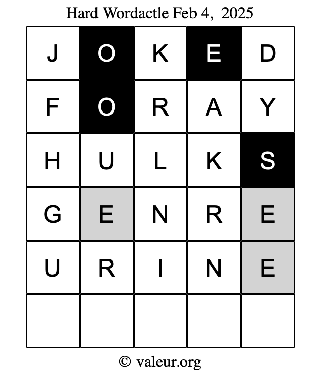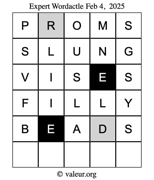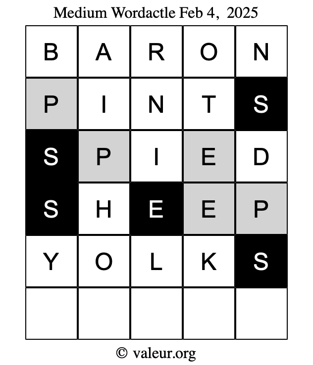Here are the February 4, 2025 daily four Wordactle puzzles. You are welcome to print a copy of the puzzles and solve them by hand. For your convenience, we have also included the solutions further down the page so you can check your work.