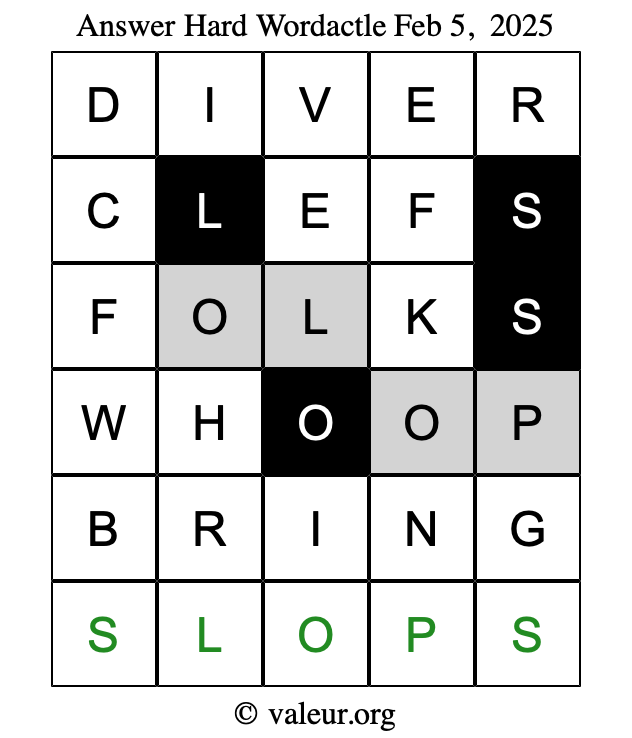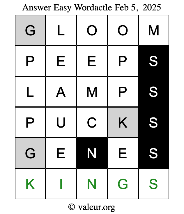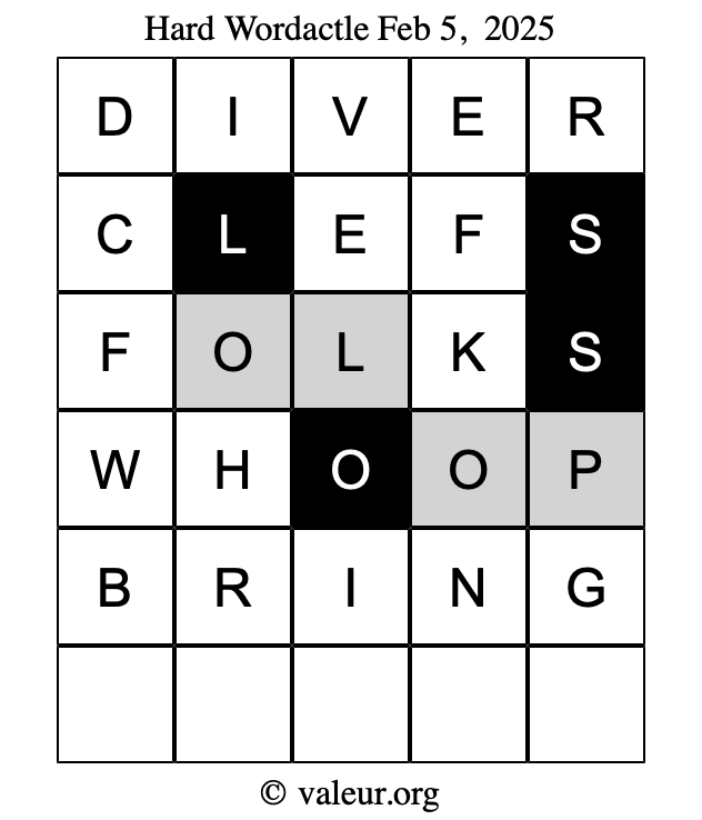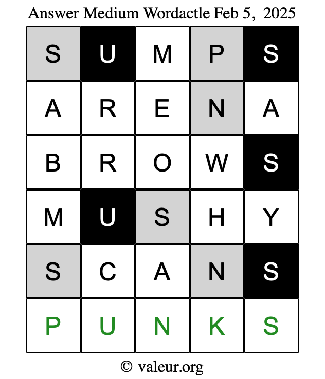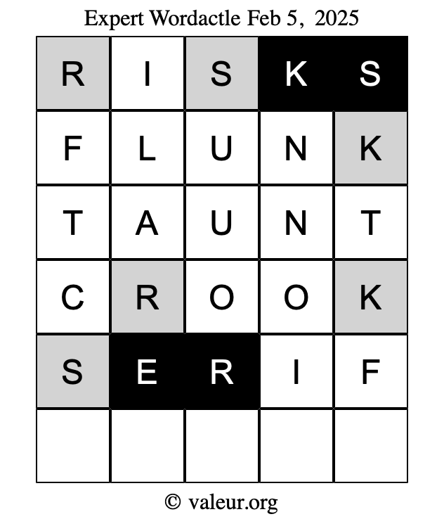 Here are the February 5, 2025 daily four Wordactle puzzles. You are welcome to print a copy of the puzzles and solve them by hand. For your convenience, we have also included the solutions further down the page so you can check your work.