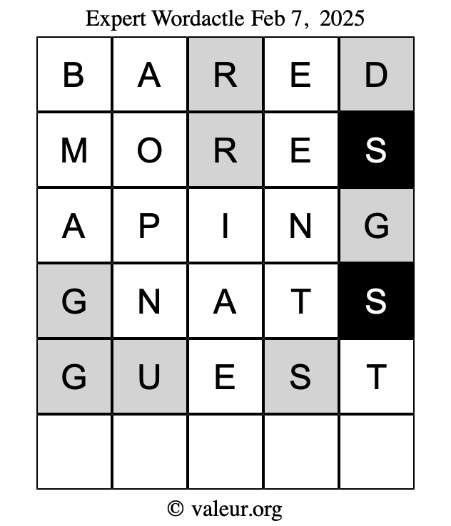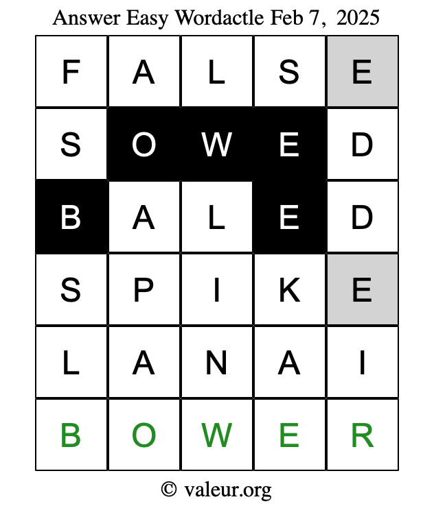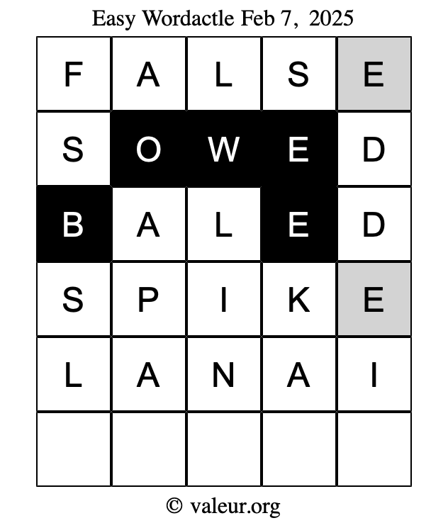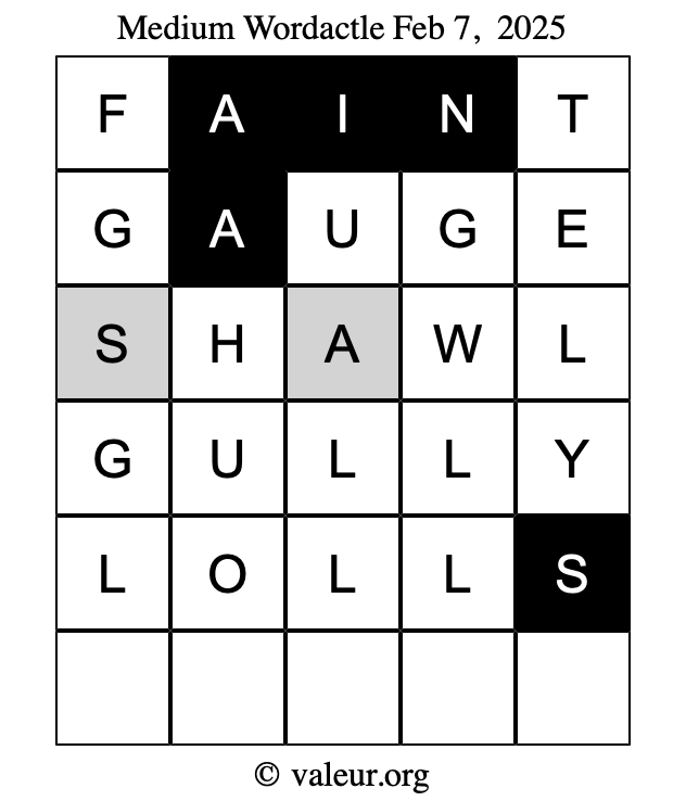 Here are the February 7, 2025 daily four Wordactle puzzles. You are welcome to print a copy of the puzzles and solve them by hand. For your convenience, we have also included the solutions further down the page so you can check your work.