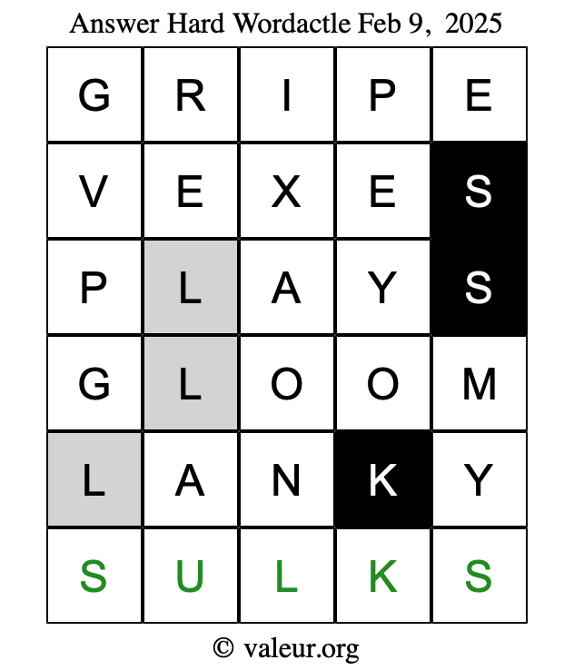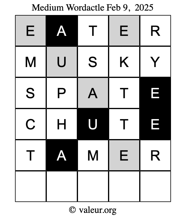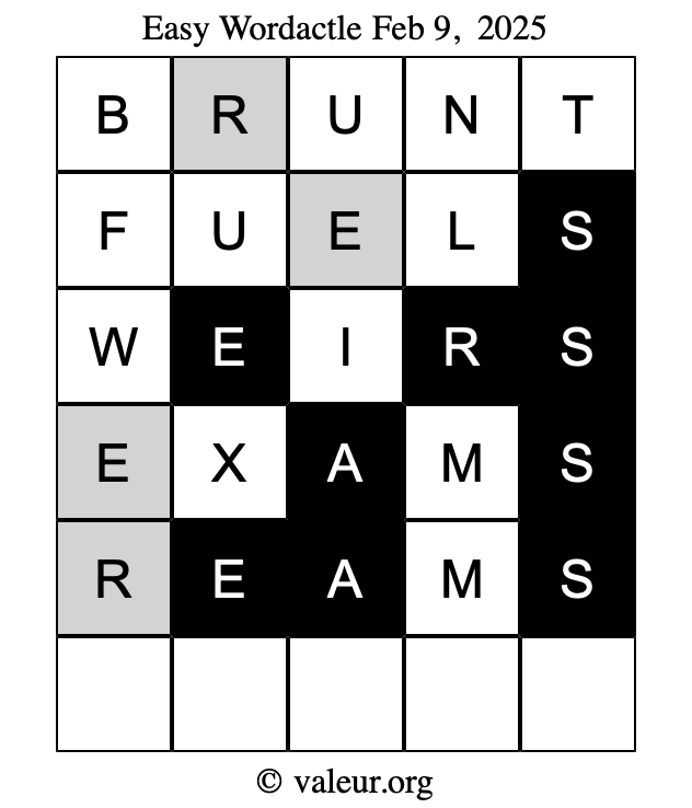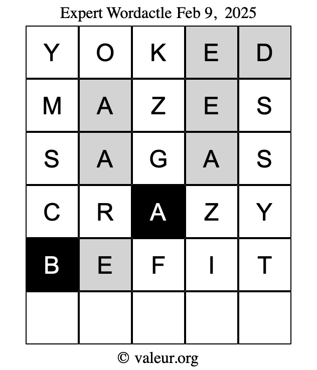 Here are the February 9, 2025 daily four Wordactle puzzles. You are welcome to print a copy of the puzzles and solve them by hand. For your convenience, we have also included the solutions further down the page so you can check your work.