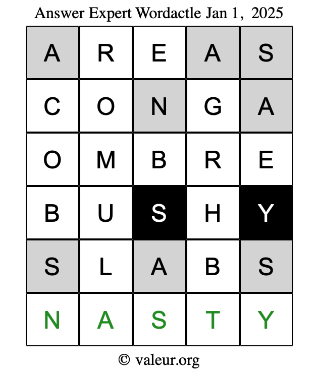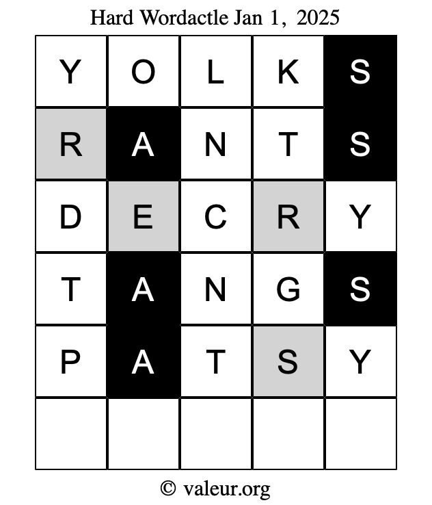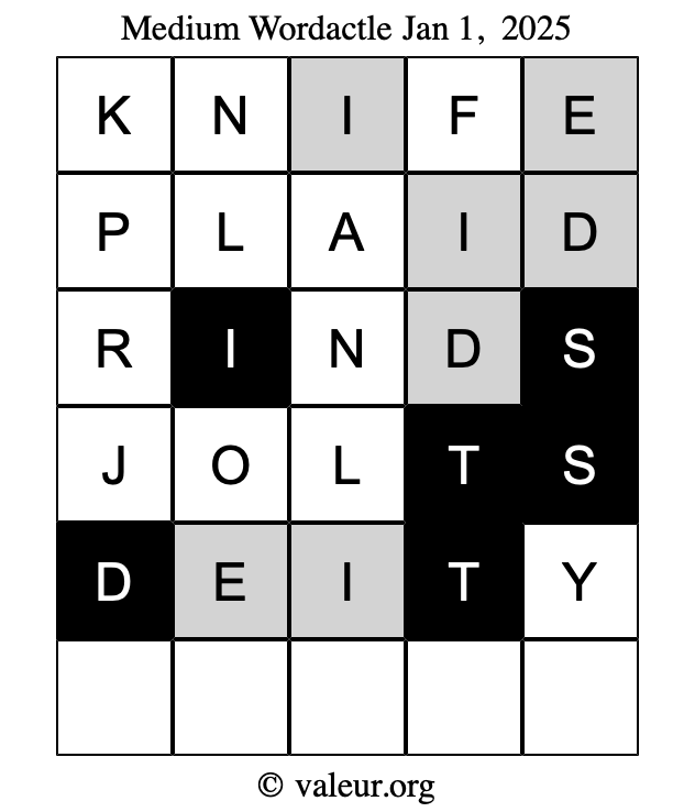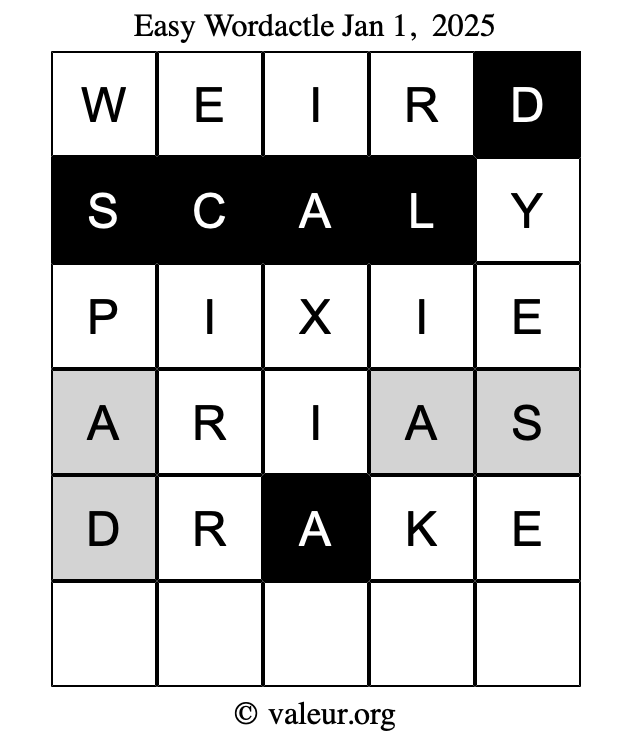 Here are the January 1, 2025 daily four Wordactle puzzles. You are welcome to print a copy of the puzzles and solve them by hand. For your convenience, we have also included the solutions further down the page so you can check your work.