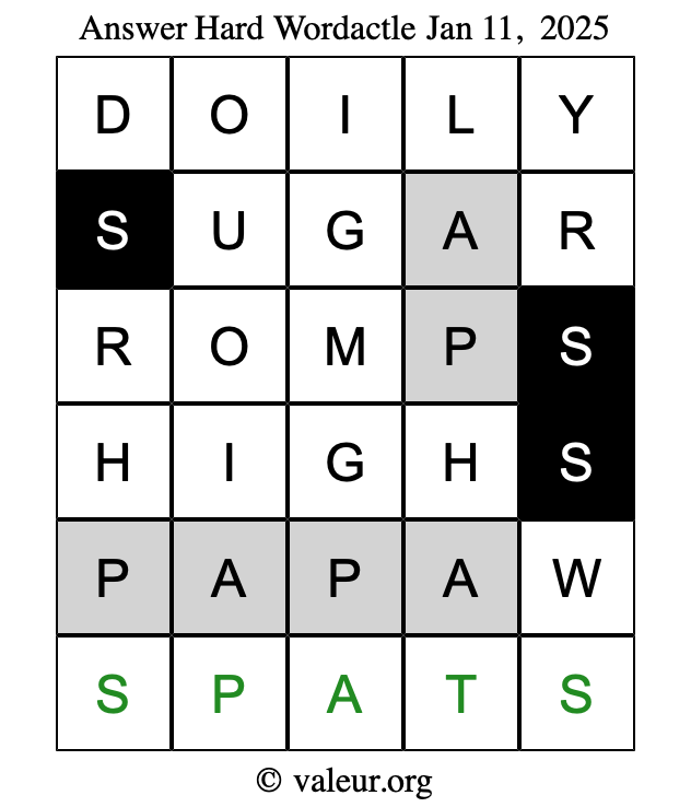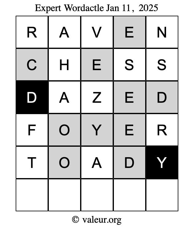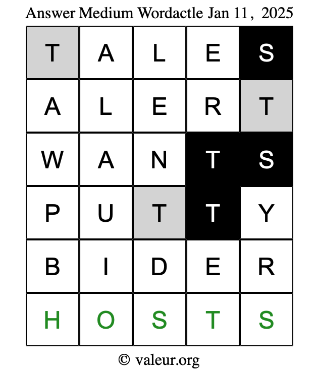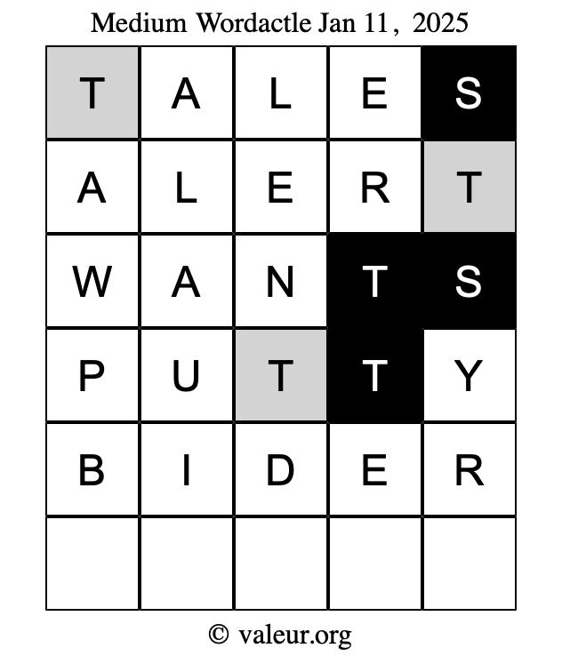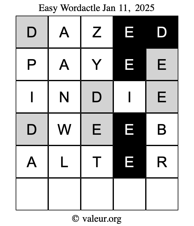 Here are the January 11, 2025 daily four Wordactle puzzles. You are welcome to print a copy of the puzzles and solve them by hand. For your convenience, we have also included the solutions further down the page so you can check your work.